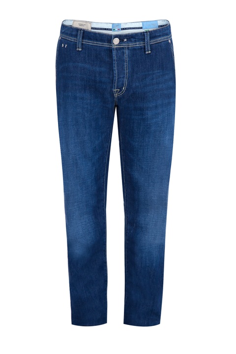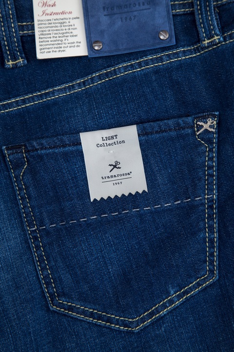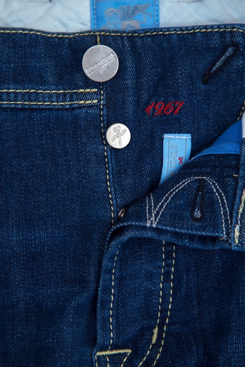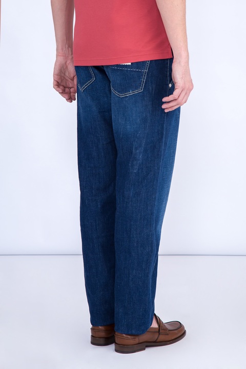 Мужские джинсы otello бренда Sartoria Tramarossa свободного кроя, выполненные вручную из плотного хлопкового денима, окрашенного в насыщенный синий цвет с легким винтажным эффектом. Особенностью модели являются фронтальные французские карманы и индивидуальная маркировка металлическими инициалами обладателя в момент покупки. Изделие дополнено нашивкой с автографами всех тех, кто участвовал в его создании. Посадка на талии обеспечивается при помощи притачного пояса с застежкой на ряд пуговиц. Сделано в Италии.