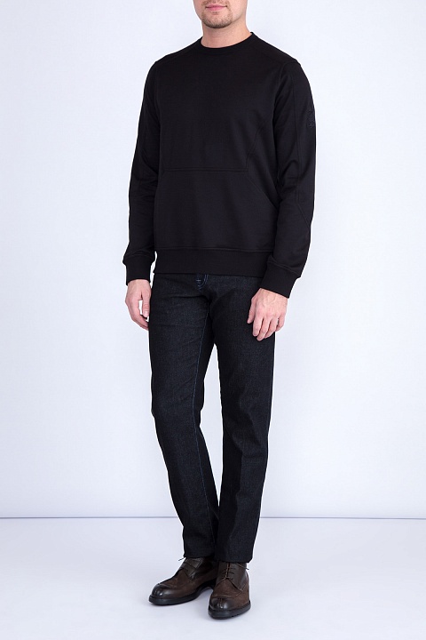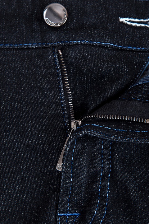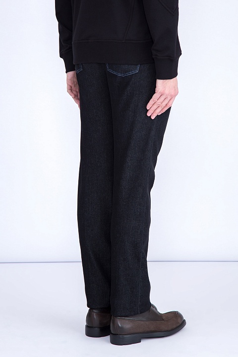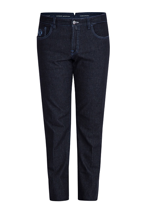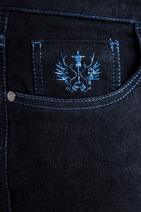 Классические мужские джинсы Scissor Scriptor фирменного прямого кроя «constant». Модель изготовлена в лучших традициях Модного дома — из хлопкового денима черного цвета с добавлением эластичных волокон, что повышает износостойкость ткани и обеспечивает идеальную посадку по фигуре. Модель характеризуется лейблом из матовой телячьей кожи на притачном поясе и пятью карманами с отсрочкой нитью светло-голубого оттенка. Карман для монет декорирован искусной вышивкой с символикой бренда. Застежка осуществляется на металлическую пуговицу, отполированную вручную. Сделано в Италии.