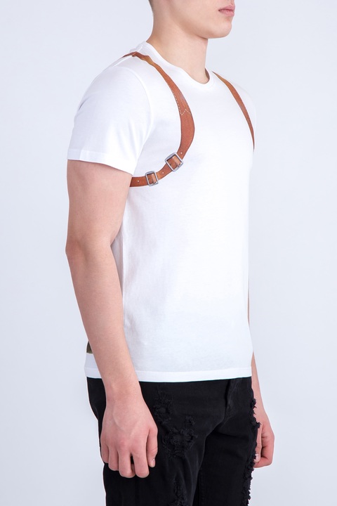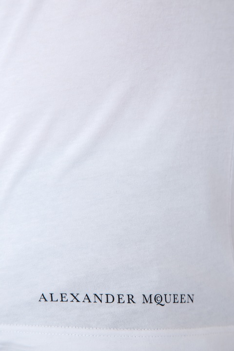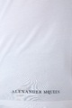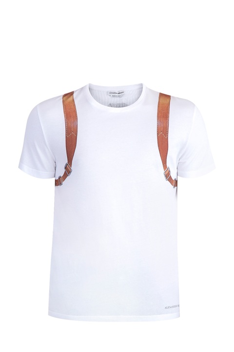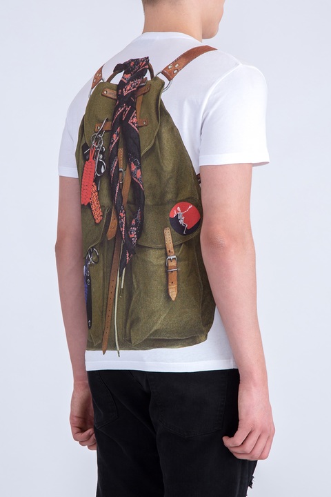 Стильная мужская футболка Alexander McQueen выполнена из мягкого хлопка белого цвета, выращенного экологически безопасным способом без использования пестицидов и удобрений. Изделие свободного силуэта, с круглым вырезом горловины и короткими рукавами. Модель украшена принтом в виде туристического рюкзака на спинке, переходящим на переднюю панель. Сделано в Италии.