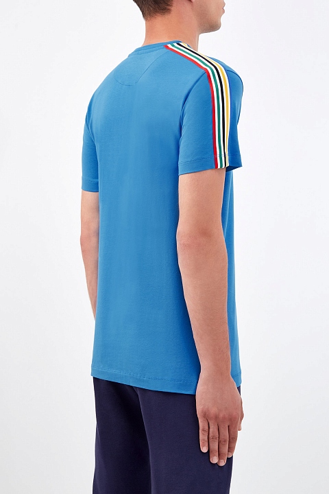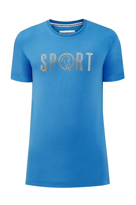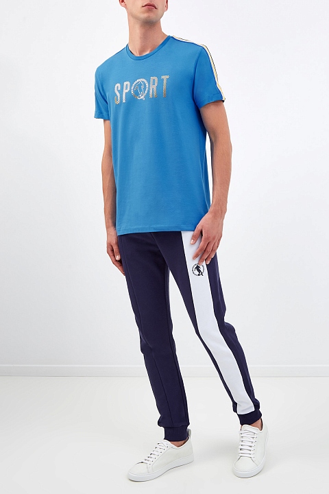 Мужская футболка в спортивном стиле от Bikkembergs выполнена в небесно-голубом оттенке из хлопкового джерси. Дышащая ткань с волокнами эластана в составе делает повседневный образ комфортным. Аппликация Sport с объемными контурами и золотистым напылением содержит фирменный логотип Soccer. Отделка контрастными лентами придает образу динамику. Детали: круглый вырез горловины, короткие рукава.