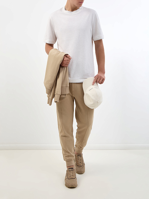 Минималистичная мужская футболка от Brunello Cucinelli выполнена из мягкого джерси в меланжево-белом оттенке — однородные волокна собранного вручную хлопка образуют гладкую фактуру ткани. Двойная окантовка подчеркивает расслабленный стиль изделия. Детали: короткие рукава, прямой нижний край, круглый вырез горловины. Сделано в Италии.