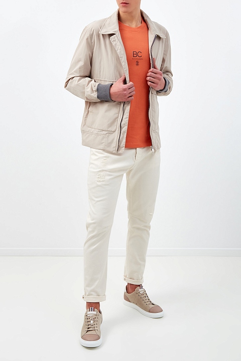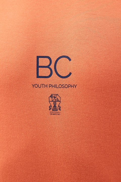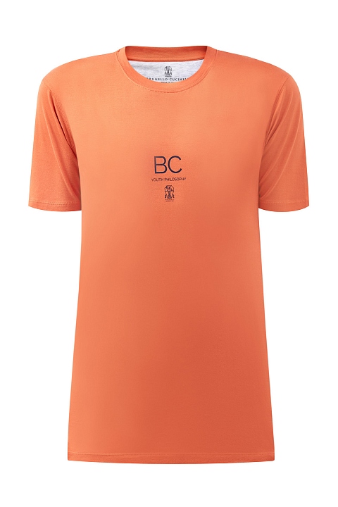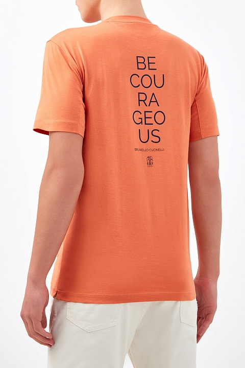 Базовая футболка от Brunello Cucinelli выполнена из джерси в оранжевом оттенке. Однородные волокна собранного вручную хлопка образуют гладкую фактуру ткани. Текстовый принт одновременно является инициалами основателя Модного дома и аббревиатурой фразы «Be Courageous, youth philosophy» — лейтмотивом новой коллекции, который призывает решительно и изящно преодолевать жизненные препятствия в соответствии с философией бренда. Сделано в Италии.