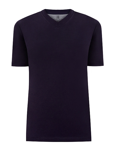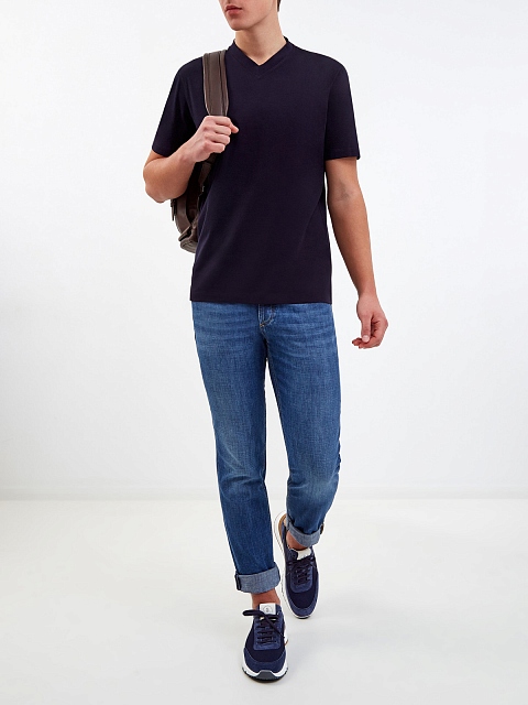 Мужская футболка в насыщенном синем цвете от Brunello Cucinelli. Базовая модель выполнена из мягкого джерси — однородные волокна собранного вручную хлопка образуют гладкую фактуру. Дышащая и гигроскопичная ткань обеспечивает полную свободу движений, делая повседневный образ максимально комфортным. Расслабленный акцент вносит V-образный вырез горловины. Сделано в Италии.
