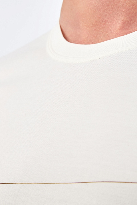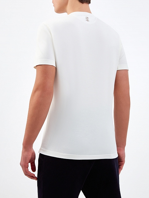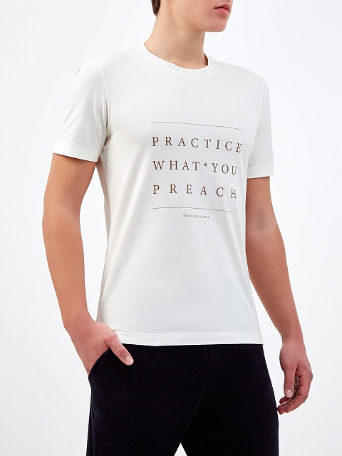 Лаконичная мужская футболка от Brunello Cucinelli выполнена из гладкого джерси в базовом белом цвете. Дышащий материал с полностью натуральным составом идеально подходит для создания повседневных образов. Минималистичный принт в стиле леттеринг с мотивом «Practice what you preach» отражает философию Модного Дома. Детали: круглый вырез горловины, короткие рукава, простроченные швы, логотип бренда на спинке. Сделано в Италии.