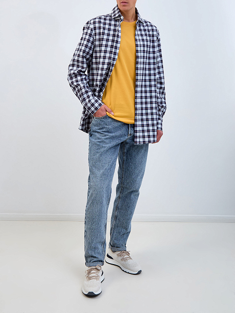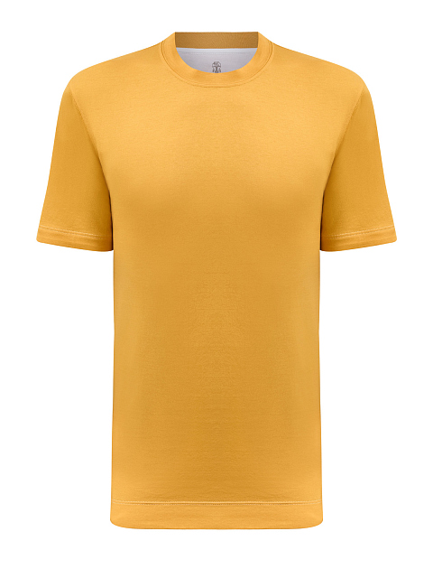 Минималистичная мужская футболка от Brunello Cucinelli выполнена из гладкого джерси в теплом желтом оттенке. Дышащий материал с полностью натуральным составом идеально подходит для создания повседневных образов. Детали: короткие рукава, прямой нижний край, круглый вырез горловины. Сделано в Италии.