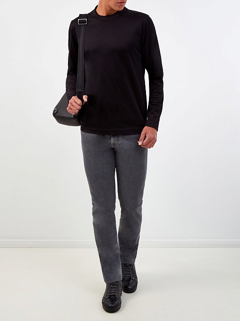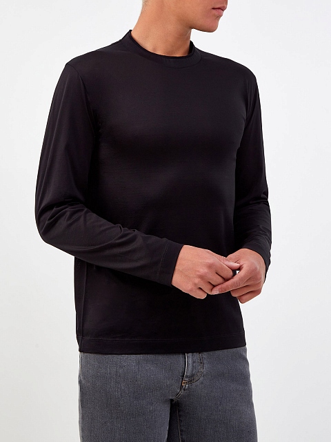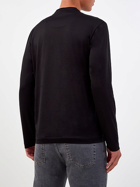 Минималистичный лонгслив от Canali создан из тонкого мерсеризованного хлопка — особая обработка ткани препятствует образованию складок, придает волокнам эластичность и мягкий сатиновый блеск. Классический черный цвет дополнит любой повседневный образ. Слегка облегающий фигуру крой не стесняет движений. Сделано в Италии.
