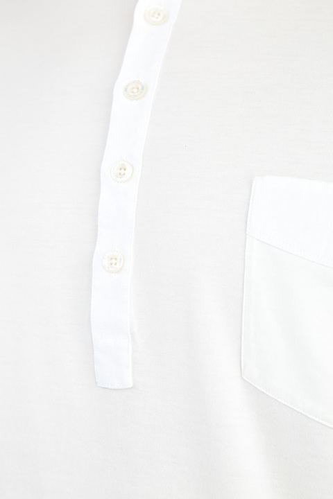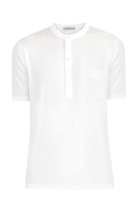 Стильная футболка от Cortigiani выполнена из хлопкового джерси с гладкой поверхностью универсального белоснежного цвета. Особенностью модели стал аристократичный воротник-стойка и планка с пуговицами из перламутра — благодаря заимствованным у классической рубашки элементам изделие органично дополнит любой образ. Детали: крой по фигуре, кромки закрыты объемным швом двойной иглой, Сделано в Италии.