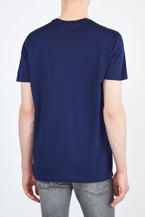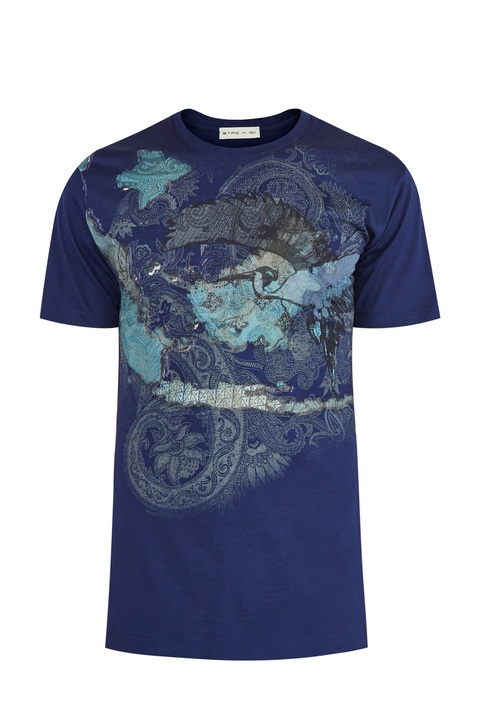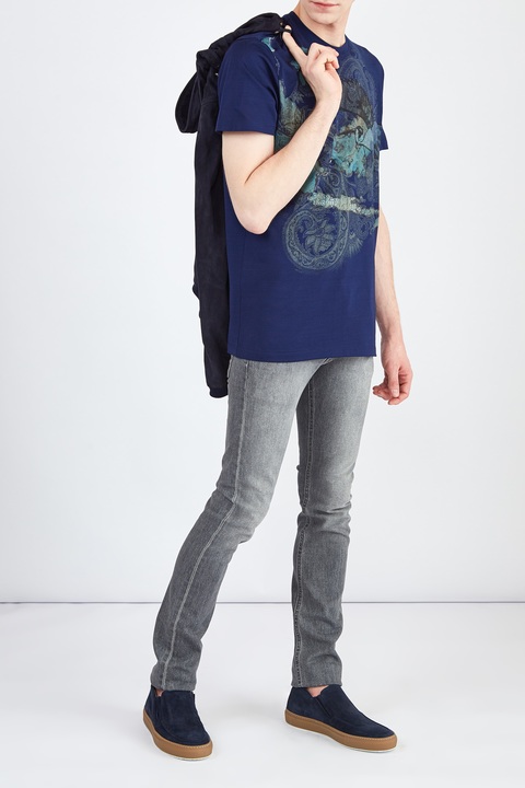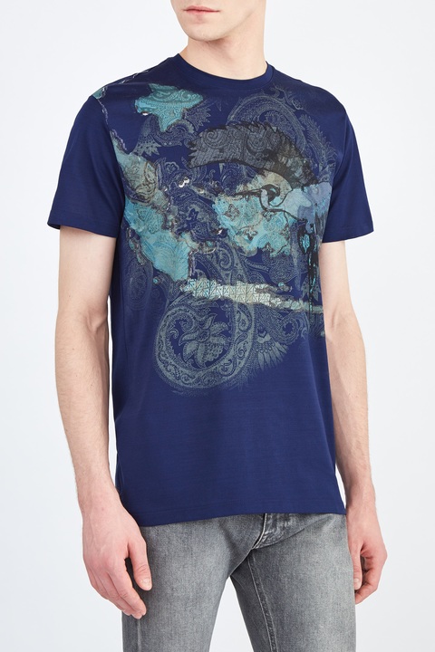 Стильная футболка кроя по фигуре от Etro выполнена из хлопкового джерси — дышащей ткани с гладкой фактурой. Изделие в насыщенном оттенке индиго дополнено аппликацией в стиле петчворк с фирменным принтом на элементах. Детали: круглая пройма горловины, короткие рукава, кромки закрыты объемным швом двойной иглой. Сделано в Италии.