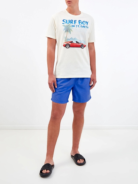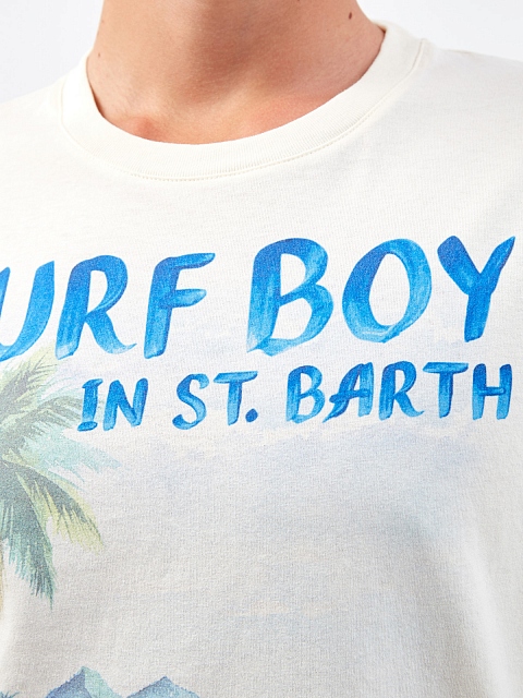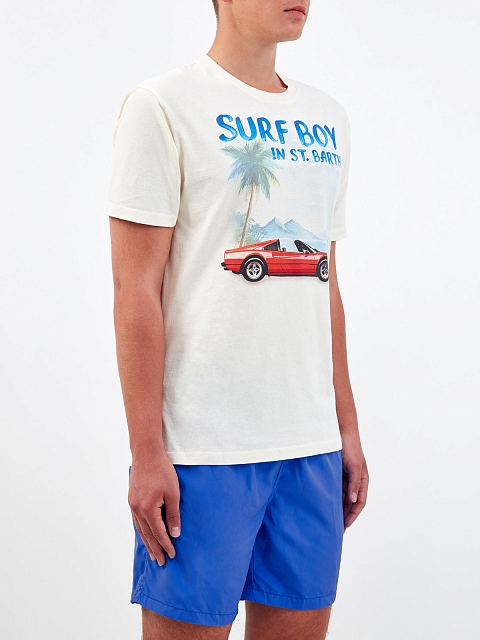 Легкая мужская футболка от MC2 Saint Barth выполнена из хлопка джерси. Модель представлена в кремовом оттенке и дополнена макро-принтом в фирменном расслабленном стиле. На рукаве — логотип бренда, а ворот украшен культовой нашивкой. Детали: короткие рукава, свободная посадка, круглый вырез.