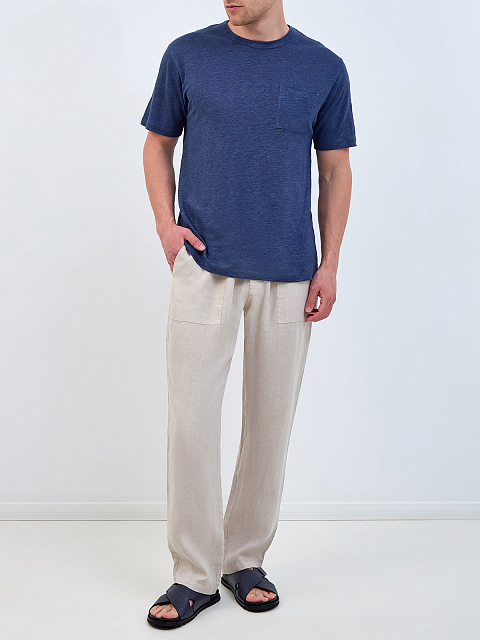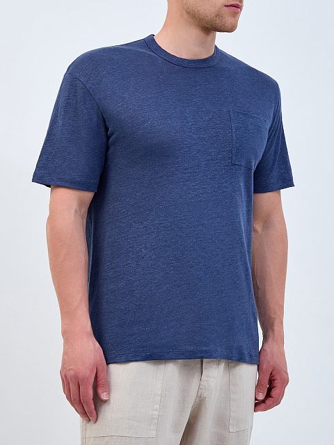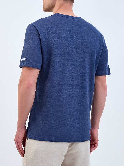 Минималистичная мужская футболка от MC2 Saint Barth выполнена из мягкого льняного джерси с неоднородной меланжевой фактурой. Полностью натуральный состав обеспечивает максимальный комфорт и идеально подходит для летнего сезона. Модель в синем цвете дополнена накладным карманом и вышитым логотипом St. Barth на рукаве. Детали: круглая пройма горловины, короткие рукава.
