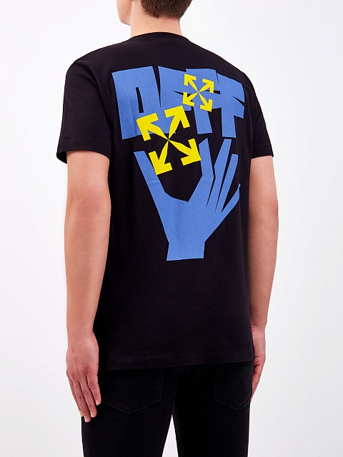 Черная мужская футболка от Off-White создана из дышащего хлопкового джерси, полностью натуральный материал обеспечивает максимальный комфорт в движении. Контрастный макро-принт Hand Offf с объемной аппликацией и фирменным логотипом Off-White создает яркий образ в стиле урбан. Детали: прямой крой, короткие рукава, круглый вырез горловины.