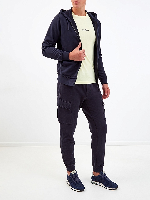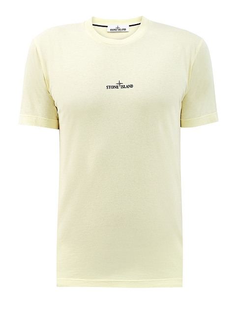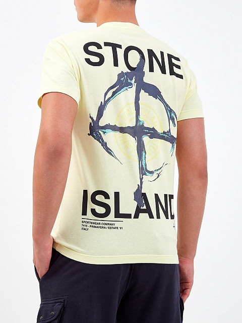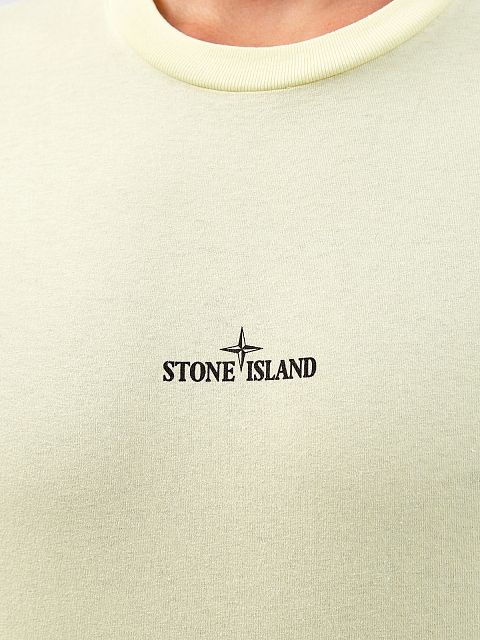 Легкая хлопковая футболка в спортивном стиле от Stone Island представлена в лимонном оттенке. Полностью натуральный состав идеально подходит для создания повседневных аутфитов, макро-принт на спинке вносит динамичный акцент в образ. Детали: короткие рукава, круглый вырез горловины, логотип на передней планке.