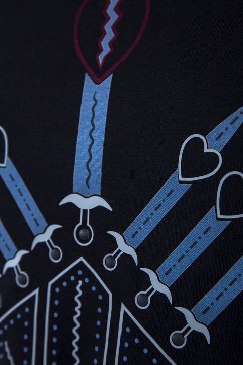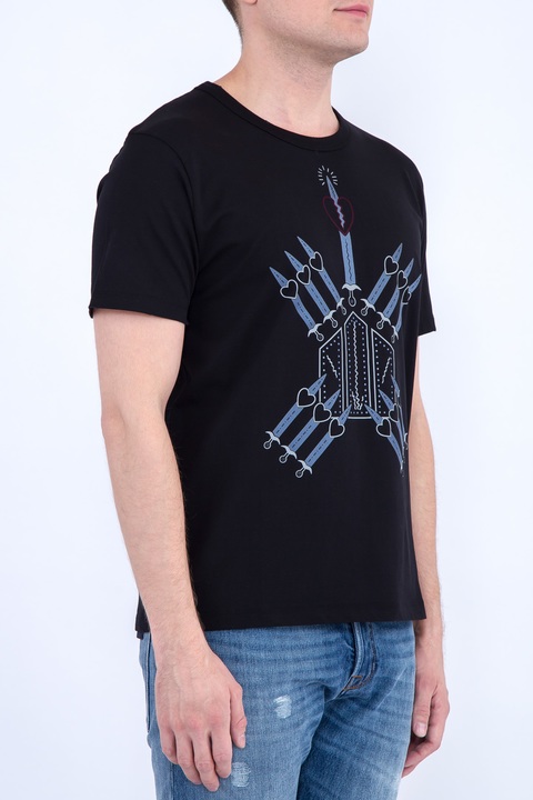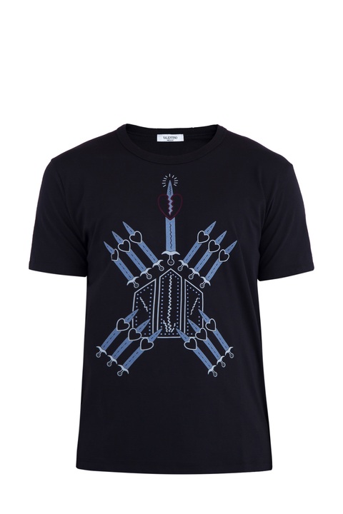 Стильная мужская футболка Valentino с неглубоким круглым вырезом горловины и короткими рукавами. Модель украшена эффектным фирменным принтом коллекции "Loveblade" в синей гамме, расположенным на передней планке. Сделано в Италии.