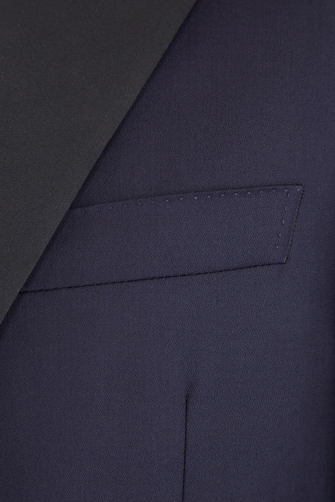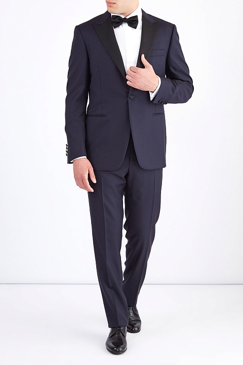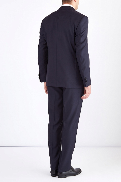 Элегантный вечерний мужской костюм классического кроя из коллекции Canali, сшитый вручную из легкой и гибкой шерстяной ткани в глубоком чернильно-синем оттенке с водоотталкивающей пропиткой. Пиджак дополнен подкладкой из атласного купро для идеальной посадки, переходящей на лацканы отложного английского ворота, перекликаясь с отделкой пуговиц и карманов. Внутренняя хлопковая отделка брюк прямого кроя обеспечивает комфорт во время носки. Сделано в Италии.