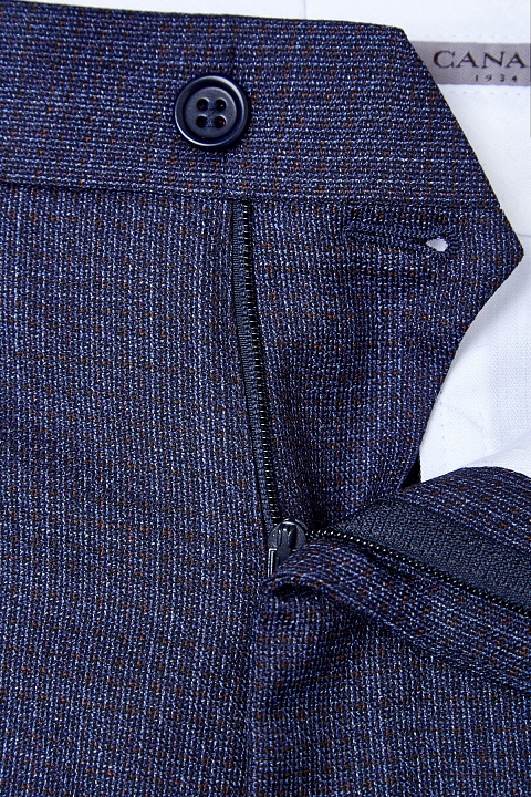 Мужской костюм в деловом стиле от Canali создан из гладкой шерстяной ткани. Классический чернильно-синий оттенок дополнен принтом в крупную точку охрового цвета. Выполненная вручную отделка является неотъемлемым атрибутом качества Made in Italy. Крой пиджака в традициях неаполитанской школы подчеркнут расположенным по косой нагрудным карманом и мягкой линией плеч. Прямые брюки дополнены четырьмя карманами. Сделано в Италии.