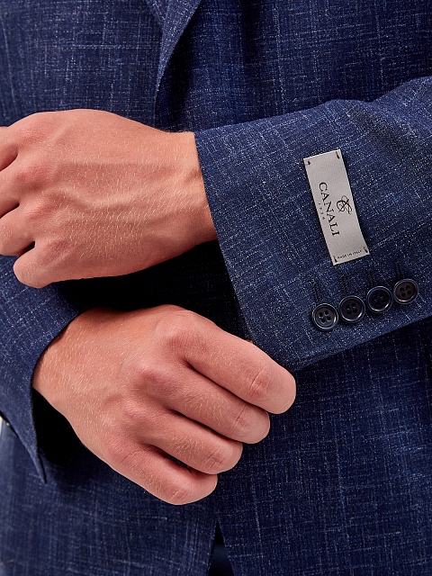 Элегантный мужской костюм от Canali за счет специальной обработки сохраняет аккуратный внешний вид и незаменим в деловых поездках. Шерстяная ткань с волокнами шелка и льна приобретает характерную неоднородную фактуру. Крой пиджака в традициях неаполитанской школы предполагает однобортную застежку и полуподкладку, которая обеспечивает свободу движений. Детали: классические прямые брюки, роговые пуговицы. Сделано в Италии.
