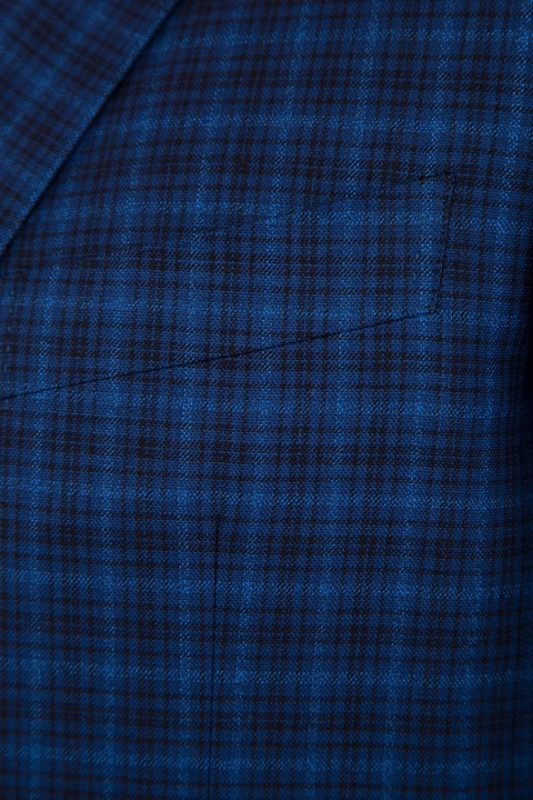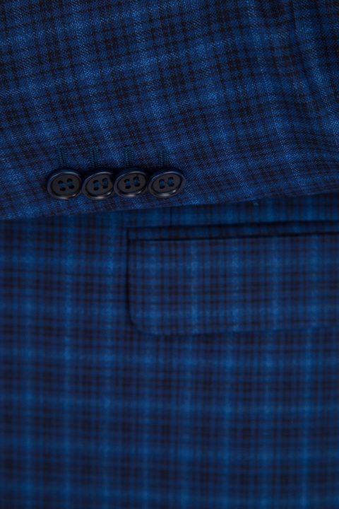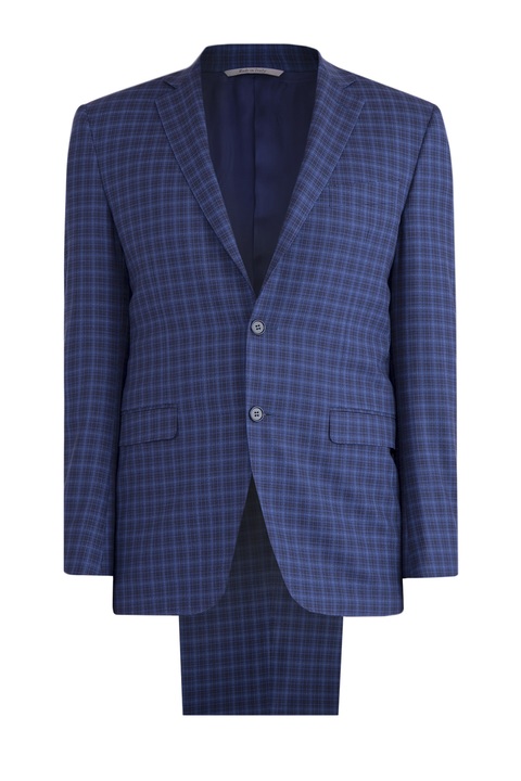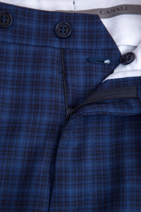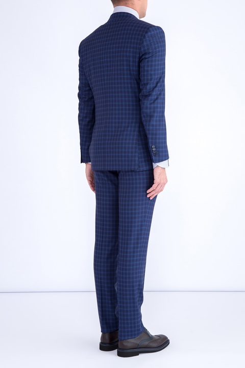 Мужской классический костюм Сanali, выполненный из тонкой и легкой шерсти с поверхностью чернильно-синего цвета с клетчатым узором. Внутренняя комфортная хлопковая отделка брюк дополнена символикой бренда, атласная подкладка пиджака из купро — потайными кармашками. Застежка пиджака стандартной длины осуществляется на две пуговицы. Сделано в Италии.