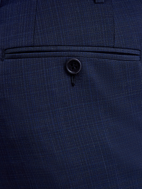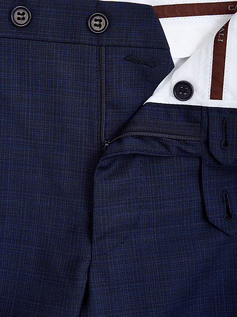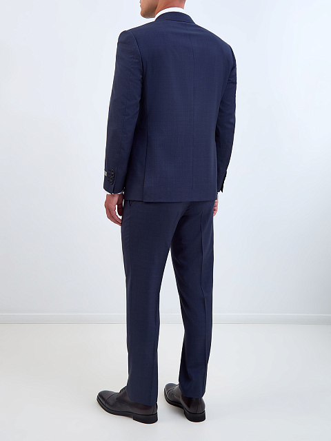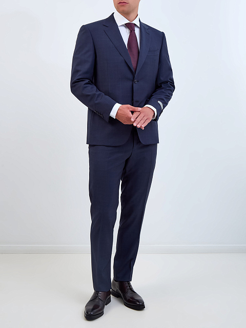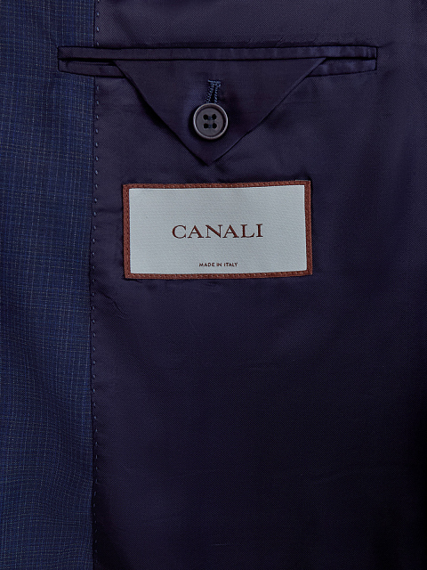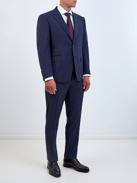 Мужской костюм в классическом стиле от Canali создан из тонкой, гибкой и эластичной шерсти. Поверхность универсального синего оттенка украшена лаконичным мелованным узором в клетку. Внутренняя комфортная хлопковая отделка брюк дополнена фирменной символикой, атласная подкладка пиджака из купро — потайными кармашками и монограммой бренда. Застежка пиджака стандартной длины осуществляется на две пуговицы. Сделано в Италии.