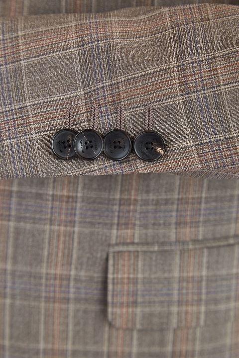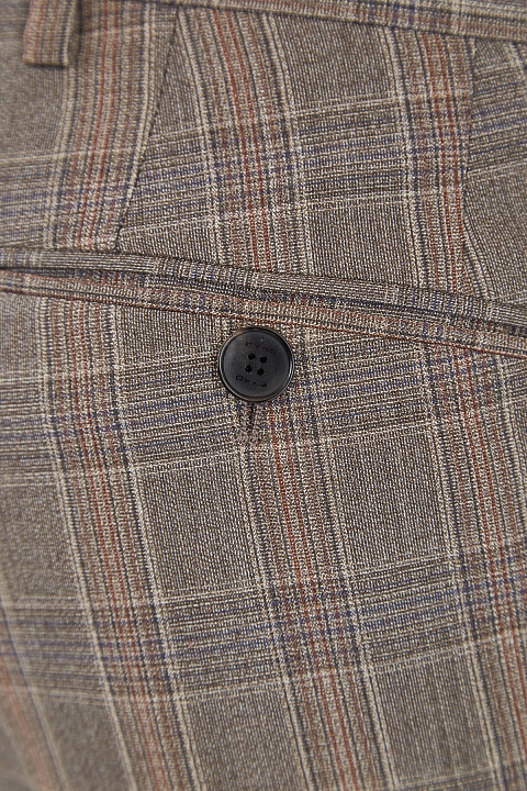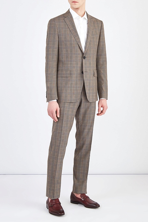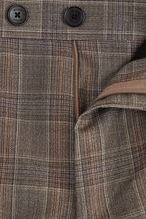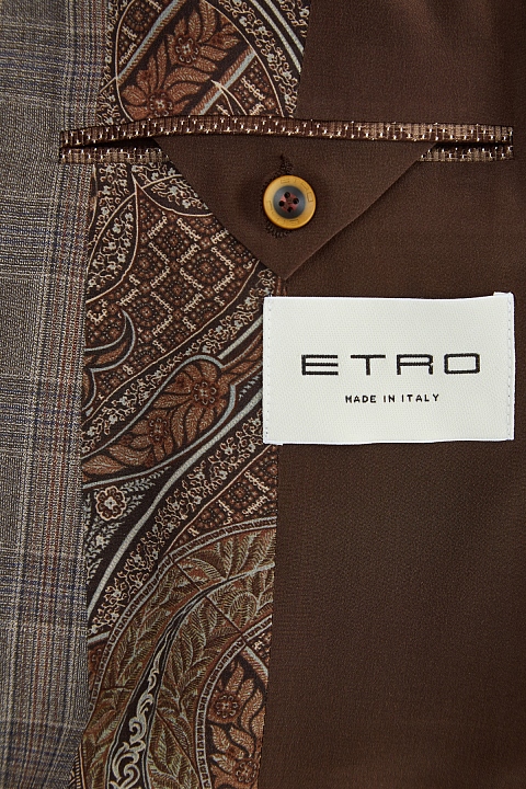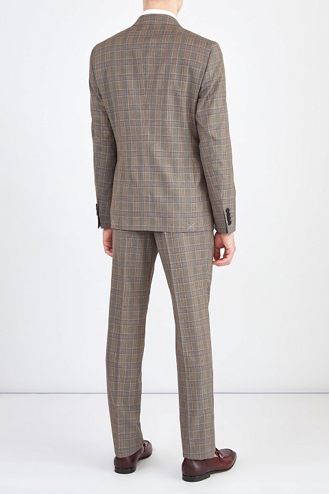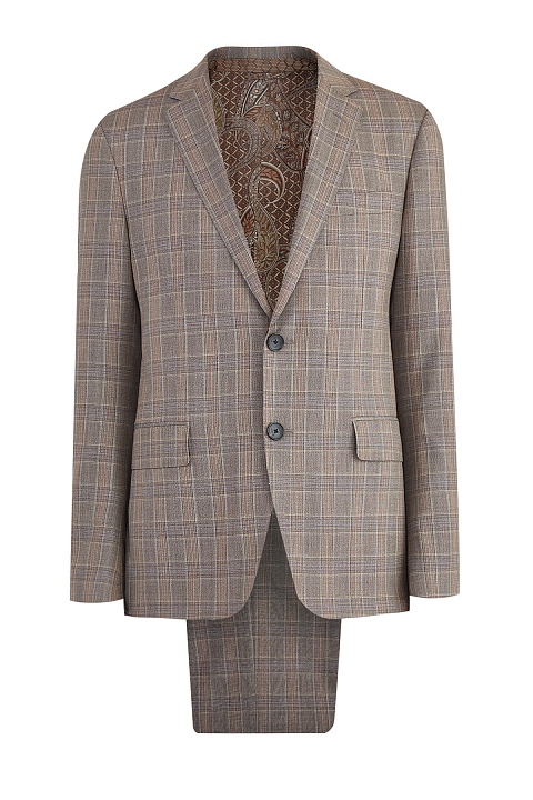Классический костюм от Etro выполнен из шерстяной ткани с добавлением волокон шелка, которые придают материалу благородный блеск. Модель создана в холодном ореховом оттенке с принтом в клетку коричневых тонов. Пиджак с широкими лацканами дополнен внутренней подкладкой для комфортной посадки по фигуре. Брюки прямого кроя оснащены застежкой на две пуговицы и молнию. Сделано в Италии.