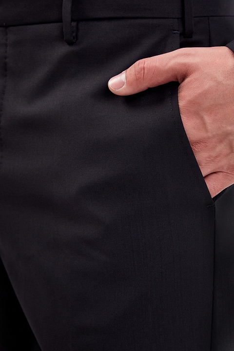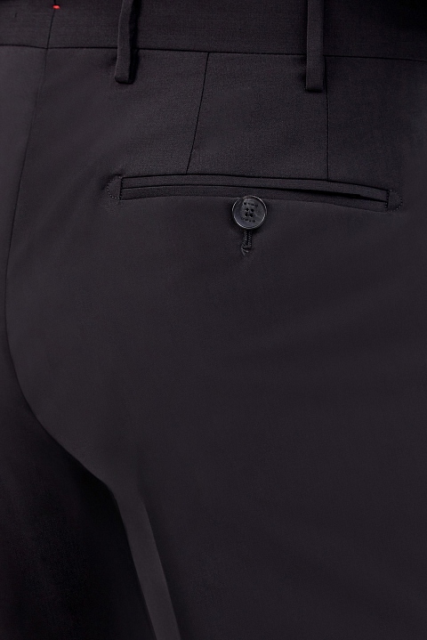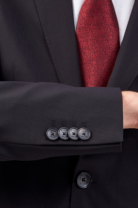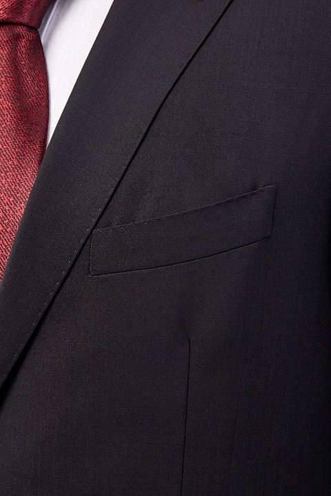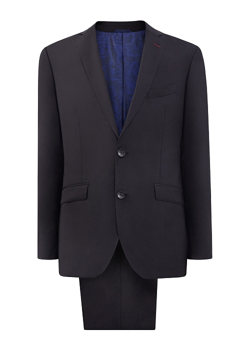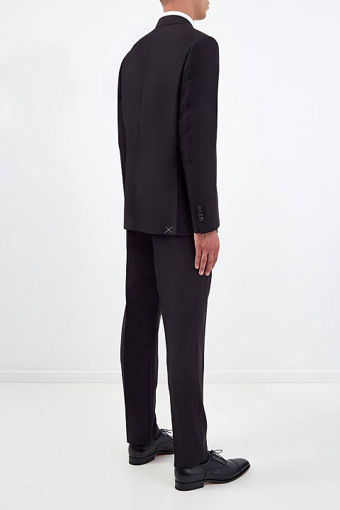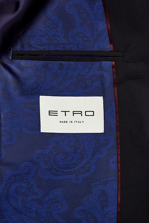 Лаконичный мужской костюм от Etro выполнен из легкой шерстяной ткани в классическом черном цвете. Внутренняя струящаяся подкладка с фирменным принтом формирует посадку по фигуре, а шлицы на спинке обеспечивают свободу движений. Яркий акцент — обтачка петлицы алой нитью. Брюки классического кроя оснащены притачным поясом и застежкой на потайные пуговицы и молнию. Карманы и лацканы пиджака оформлены выполненным вручную швом. Сделано в Италии.