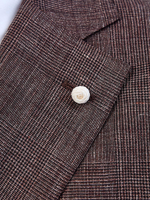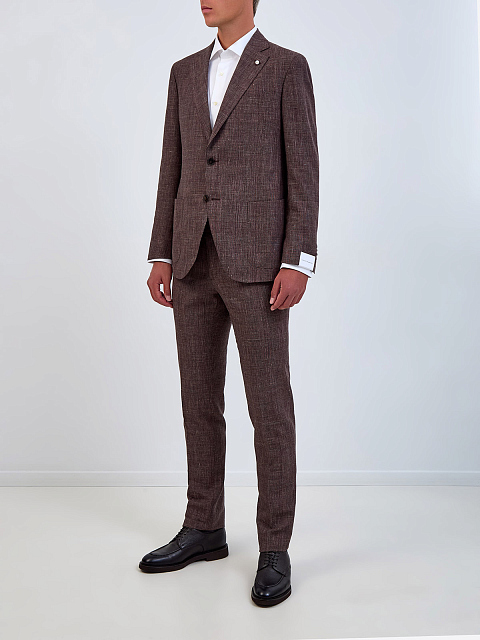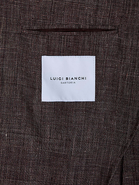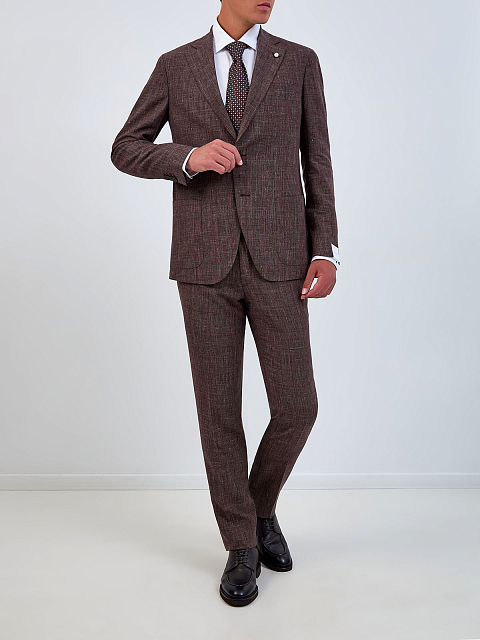 Элегантный мужской костюм-двойка вошел в бизнес-коллекцию Luigi Bianchi. Модель с безупречным комфортным кроем сшита из премиальной льняной и шерстяной ткани в клетку. Изделие в неаполитанском стиле без подкладки характеризуется классической формой, накладными карманами и брошью на лацкане английского ворота — фирменным символом бренда. Сделано в Италии.