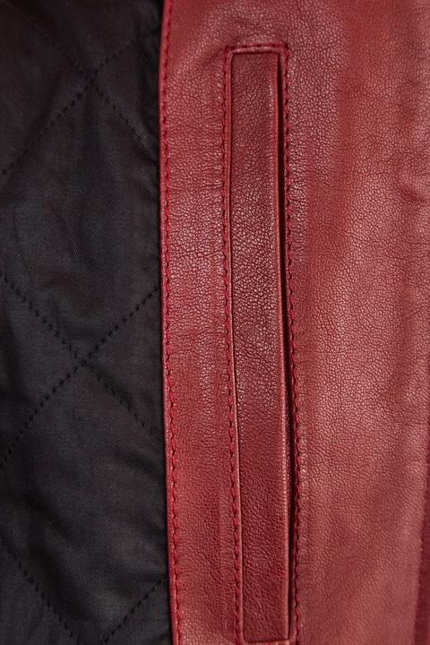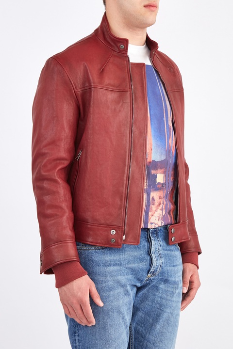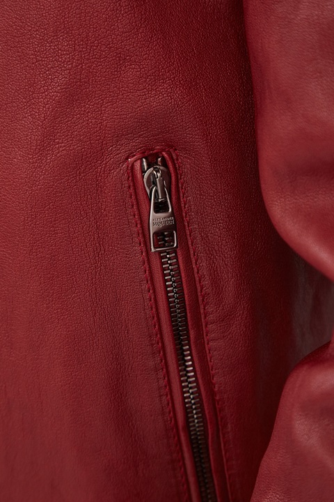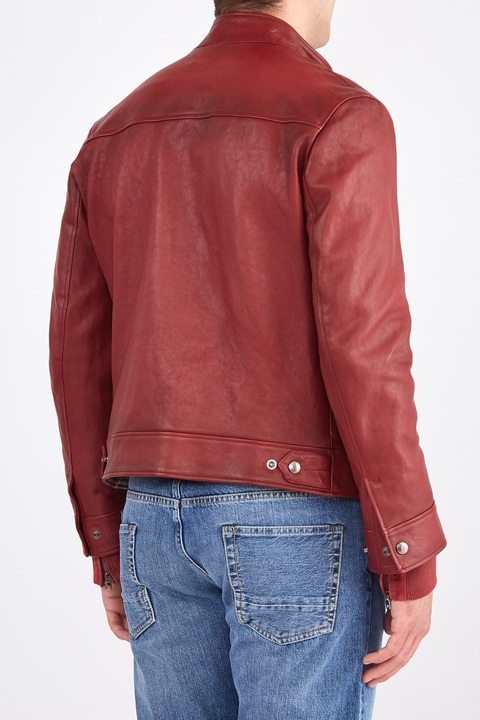 Яркая мужская куртка из коллекции Alexander McQueen с воротом-стойкой, создана из гибкой мягкой кожи наппа, обработанной паром для создания винтажного эффекта. Модель бордового тона с легким затемнением у швов дополнена внутренней стеганной подкладкой и трикотажными манжетами. Благодаря продуманному крою куртка идеально садится и не сковывает движений. Сделано в Италии.