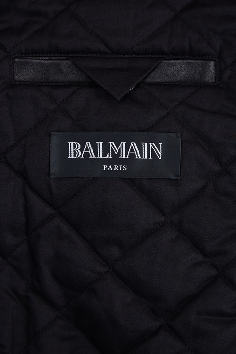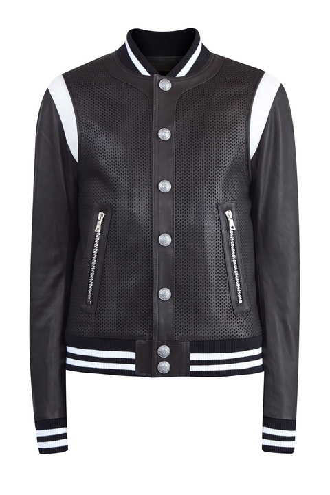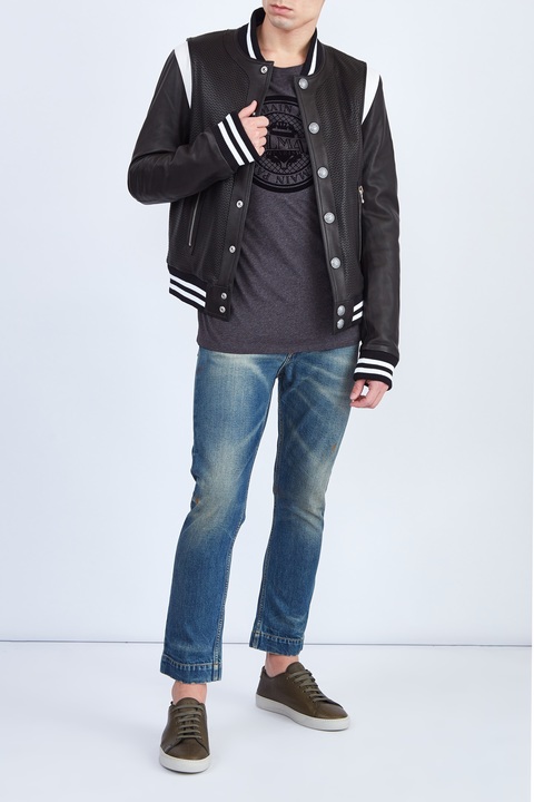 Стильная мужская куртка от Balmain создана из мягкой овечьей кожи в монохромной черно-белой гамме. Передние планки с перфорированным узором дополнены контрастным вставками для придания образу эффекта многослойности. Заимствованный у бомбера крой подчеркнут воротом характерной формы, а также эластичной тесьмой по кромкам. Детали: стеганая внутренняя поверхность с утепляющей прослойкой, застежка на кнопки, прорезные карманы.
