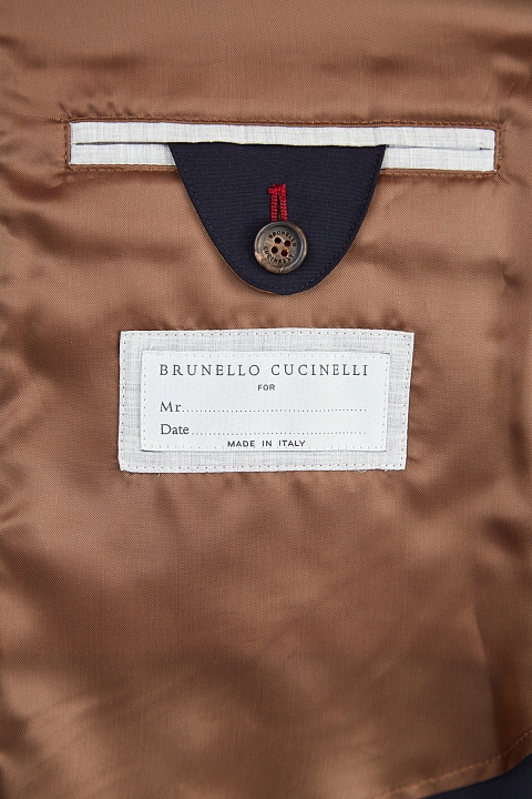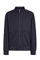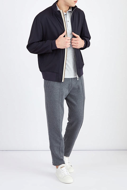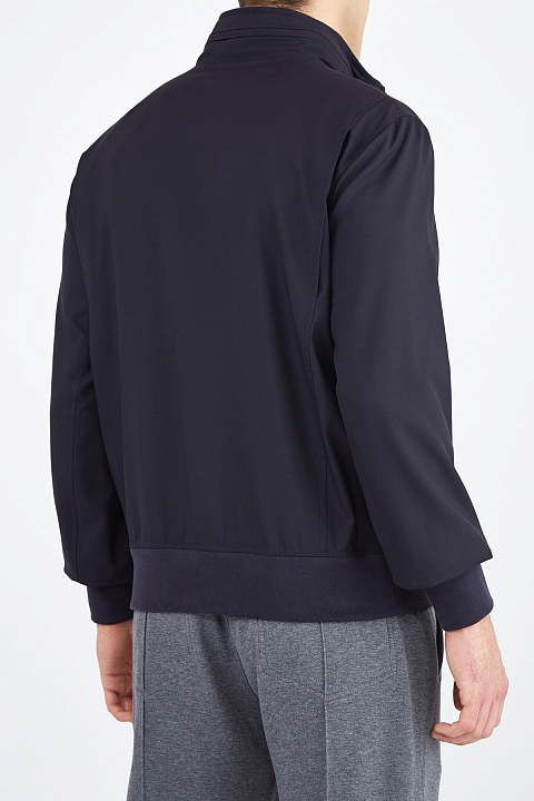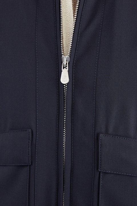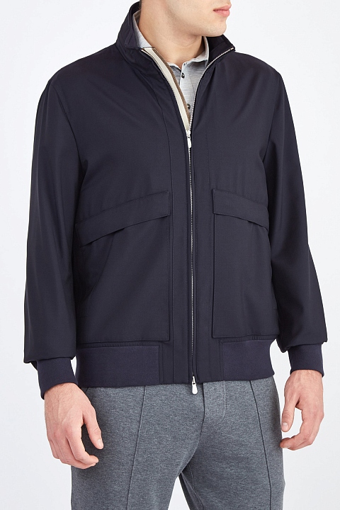 Лаконичная куртка-бомбер от Brunello Cucinelli свободного кроя с воротом-стойкой. Модель выполнена из водонепроницаемой шерстяной ткани 120's темно-синего цвета с трикотажной нижней кромкой и вставкой из льняной ткани в полоску вдоль застежки на молнию с двойным бегунком. Внутри: атласная полуподкладка из купро. Расслабленный образ дополняют накладные карманы по бокам. Сделано в Италии.