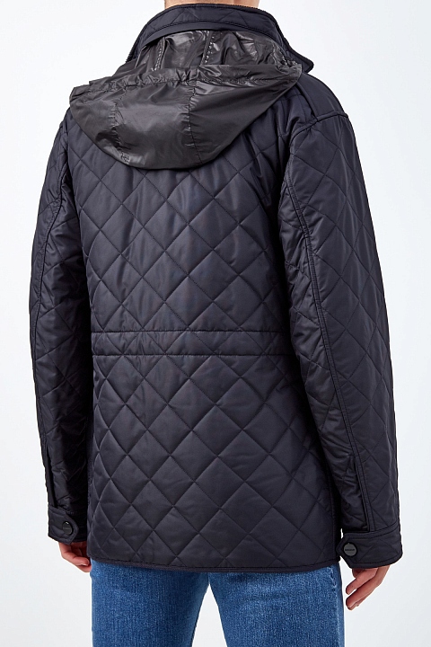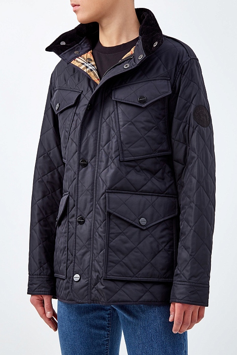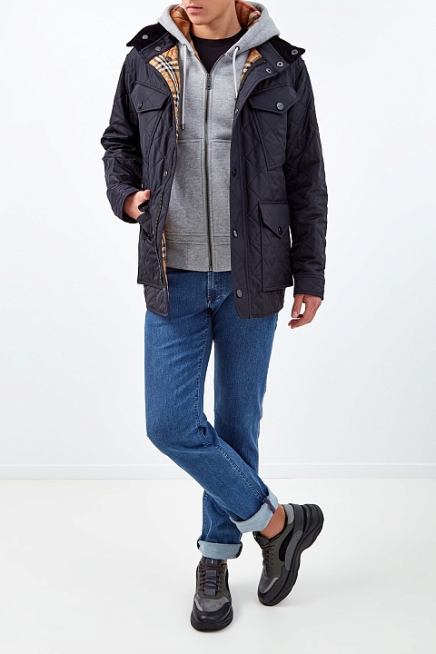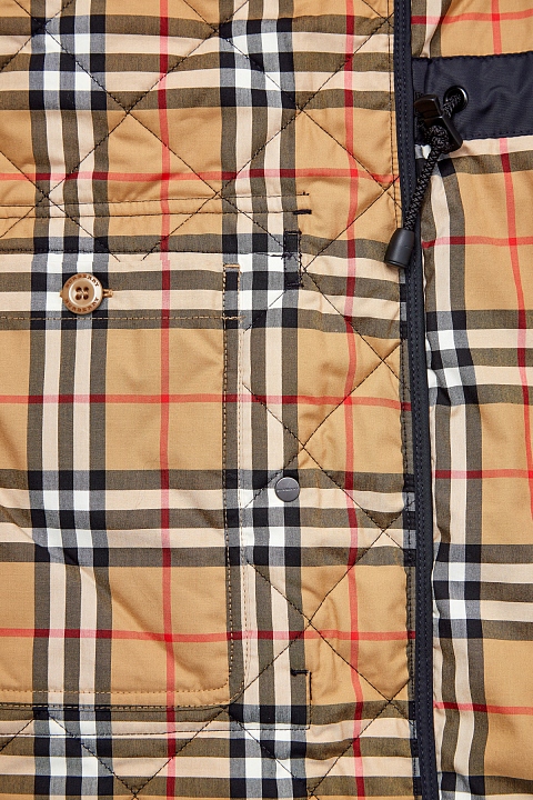 Стеганая куртка от Burberry выполнена из нейлона с терморегулирующей технологией 37,5® — благодаря специальному составу, ткань дышит и быстро высыхает, не допуская переохлаждения или перегрева. Внутренняя подкладка полностью выполнена из хлопка с фирменным принтом Vintage Check. Воротник из вельвета вносит в образ контрастный акцент. Функциональный дизайн предусматривает потайную кулиску для индивидуальной регулировки и складываемый капюшон. Длина по спинке 79 см.