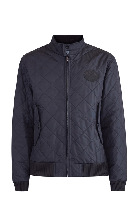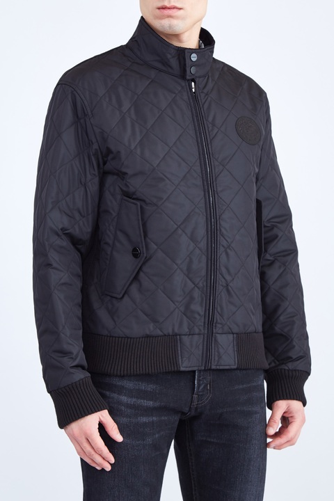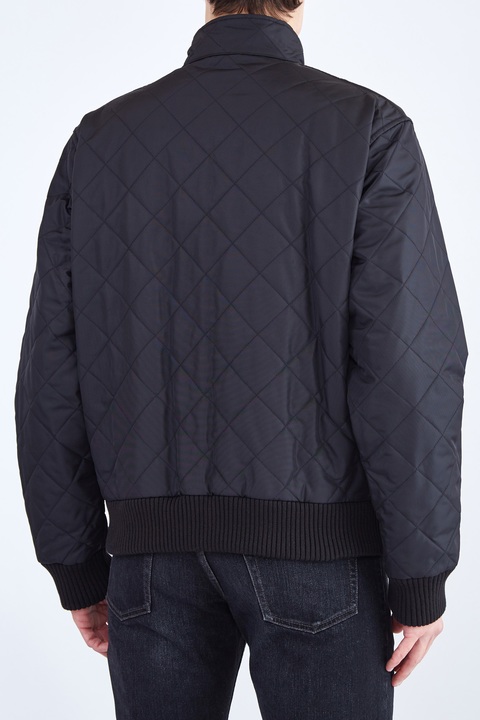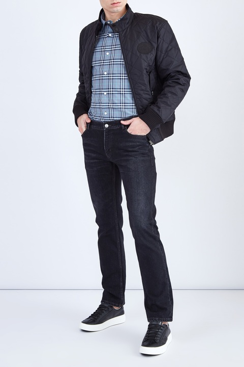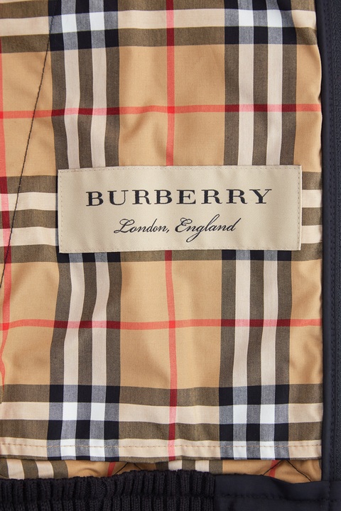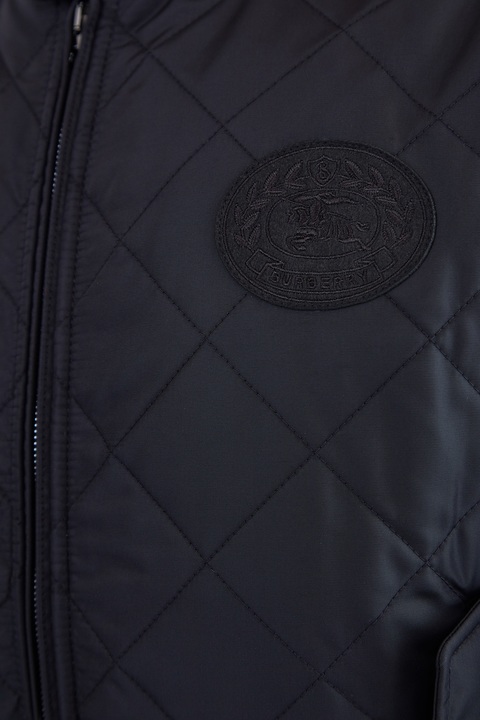 Удлиненная мужская куртка из коллекции Burberry, сшитая из водонепроницаемого нейлона черного цвета, простеганного ромбами с терморегулирующей технологией, что позволяет поверхности дышать и обеспечивать защиту от низких температур. Модель дополнена внутренней подкладкой в клетку Vintage Check и вышитым винтажным логотипом на рукаве. Ворот-стойка оформлена вельветовой вставкой, передняя планка дополнена накладными карманами.
