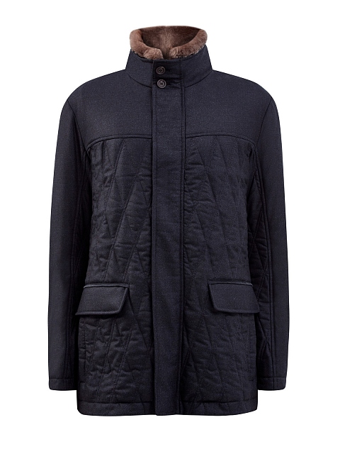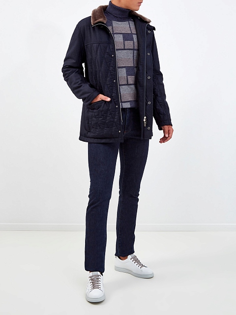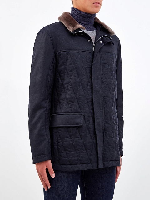 Функциональная мужская куртка от Canali создана из теплой шерстяной фланели в антрацитово-сером оттенке. Фирменная водоотталкивающая обработка материала и стеганая отделка делают модель идеальной для осеннего сезона. Съемный меховой воротник из натуральной овчины обеспечивает дополнительную защиту от ветра и холодного воздуха. Детали: двойная застежка на молнию и кнопки, объемные накладные карманы, внутренняя регулируемая кулиска. Сделано в Италии.