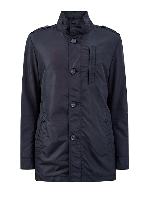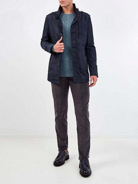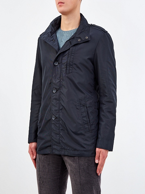 Куртка в классическом стиле от Cudgi. Модель выполнена из технического водонепроницаемого габардина, материал с диагональным переплетением волокон обеспечивает защиту от ветра и подчеркивает строгий крой изделия. Внутри ворота-стойки спрятан капюшон. Шлицы на спинке обеспечивают свободу движений. Детали: пуговицы из перламутра, двойная линия застежки, прорезные карманы.