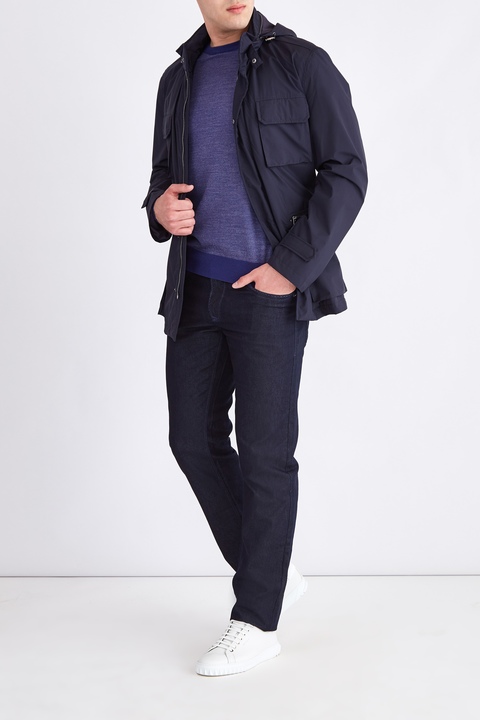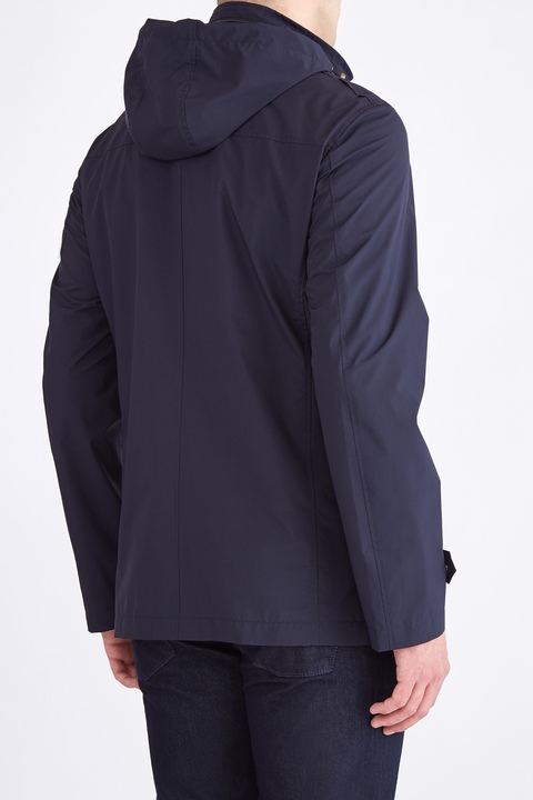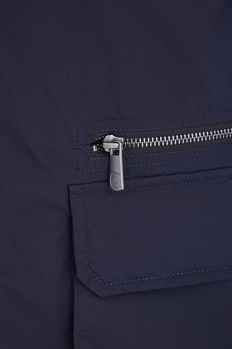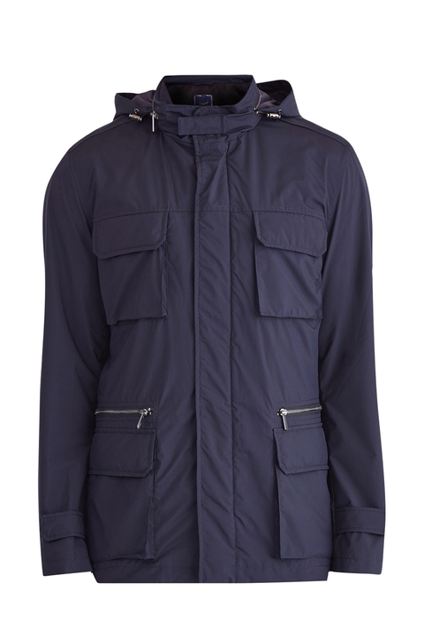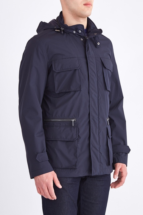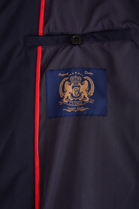 Удлиненная мужская куртка-ветровка Cudgi прямого кроя. Модель выполнена из водонепроницаемой плотной ткани синего цвета с вместительными накладными карманами по бокам и на груди. Внутри два прорезных кармана на пуговице с фирменной нашивкой и комфортная дышащая подкладка. Комфорт во время носки обеспечивает ветрозащитный ворот-стойка и влагостойкий отстегивающийся капюшон.