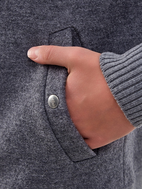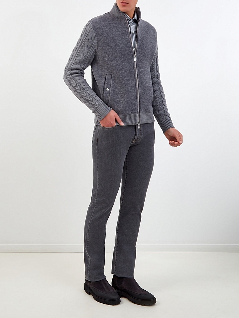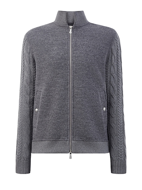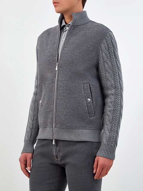 Стильный мужской бомбер от Eleventy сочетает плотную шерстяную ткань и рукава в технике аранской вязки с мотивом «косы». Пепельно-серая гамма и комфортный прямой крой делают модель универсальным дополнением повседневных многослойных образов. Изделие дополнено застежкой на молнию с брендированными пуллерами, карманами на кнопках и эластичными кромками.