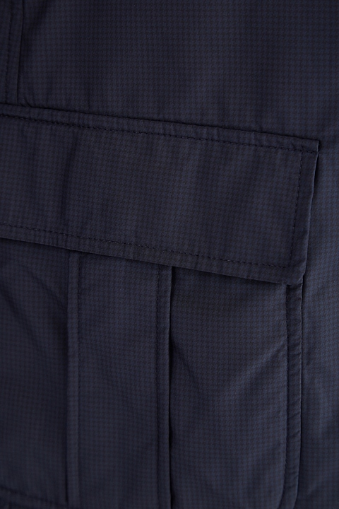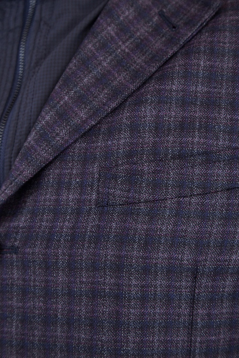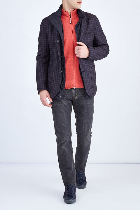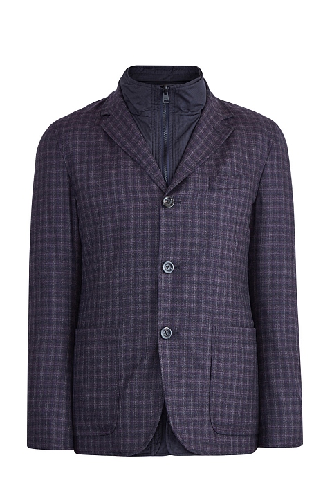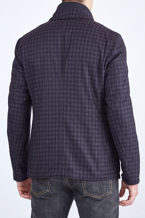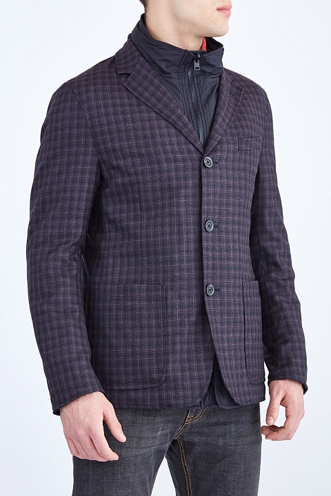 Оригинальный мужской двусторонний блейзер из коллекции Etro с нейлоновой курткой. Пиджак с тремя пуговицами и накладными карманами выполнен из шерсти с фактурной поверхностью с клетчатым узором, оттеняющим основной серый цвет. Особенностью изделия стала внутренняя нейлоновая куртка с воротом-стойкой, накладными карманами и замком-молнией. Сделано в Италии.