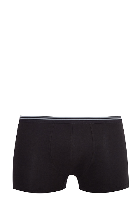 Мужские трусы-боксеры Zimmerli, сшитые вручную из тонкого дышащего материала черного цвета на основе хлопка и эластичных волокон, обеспечивающих комфортное прилегание к телу. Заниженная посадка осуществляется при помощи притачного пояса с узором в виде полос контрастного тона.