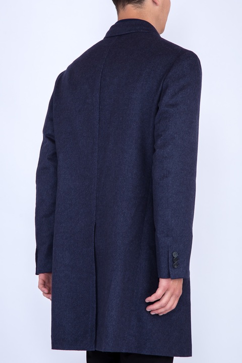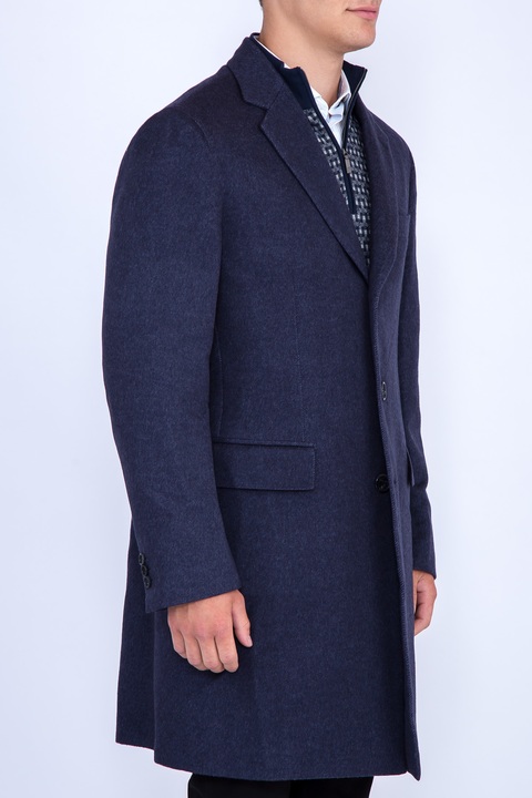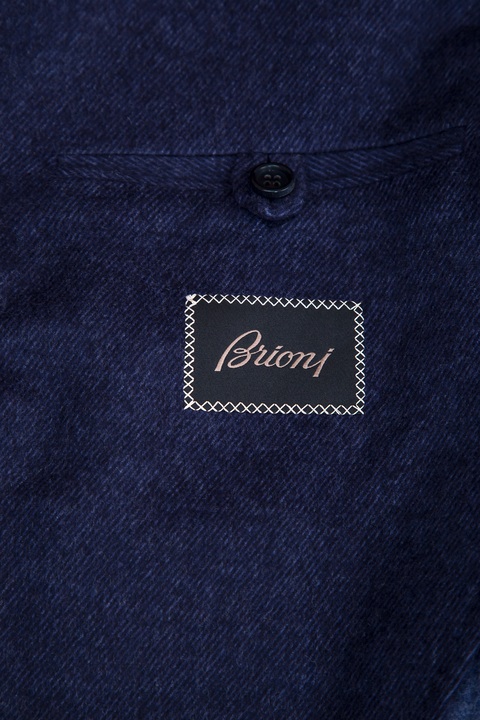 Классическое мужское пальто Brioni прямого кроя, выполненное из микса шерсти, шелка и кашемира, образующих фактурную поверхность синего цвета. Модель без внутренней подкладки, с английским отложным воротником, застежкой на пуговицы и прорезными карманами с клапанами по бокам. Сделано в Италии.