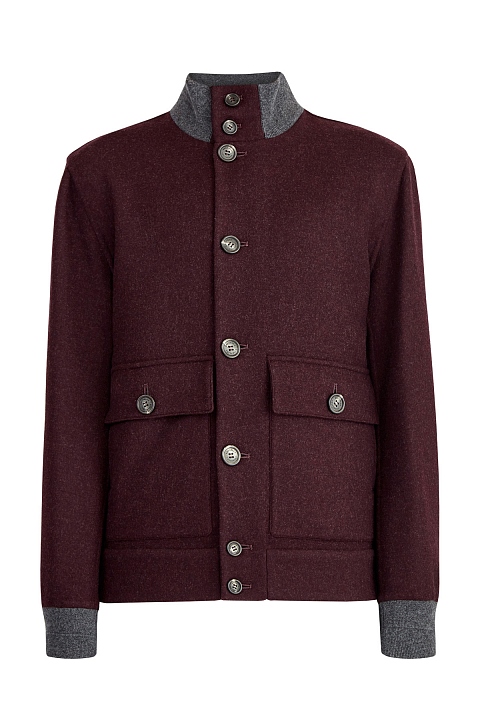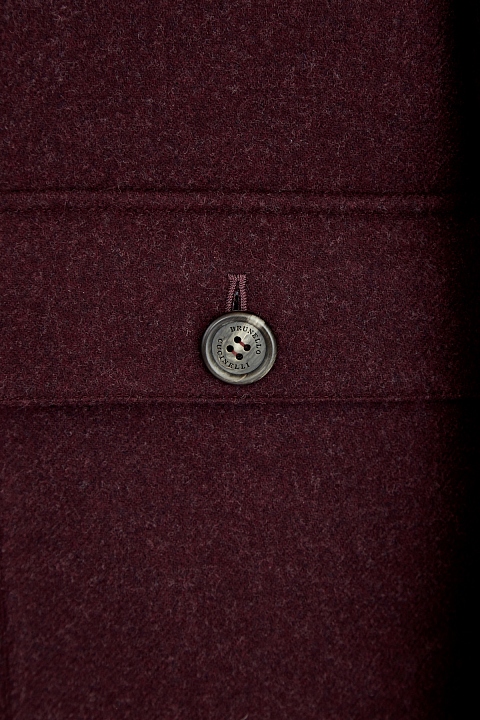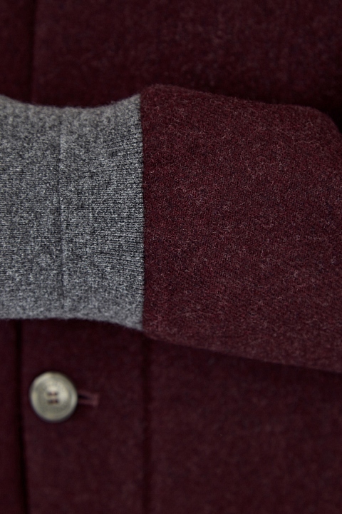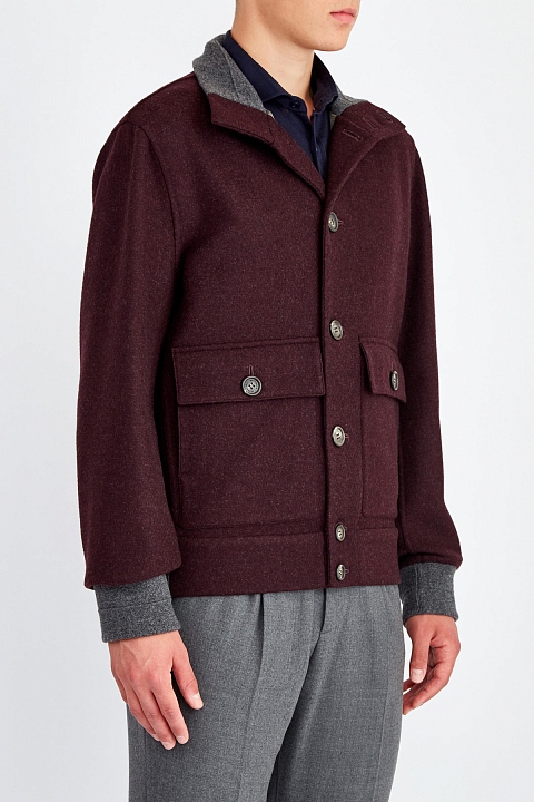 Укороченное пальто из шерстяного волокна от Brunello Cucinelli в цвете «бордо». Модель прямого силуэта дополнена двумя большими накладными карманами с клапанами. Подкладка из купро гарантирует комфортную посадку по фигуре. Силуэт дополнен воротом-стойкой, уплотненными манжетами и нижней кромкой изделия в технике плотной английской вязки. Элементы из пряжи в платиново-сером цвете выполнены из шерсти, кашемира и шелка. Сделано в Италии.
