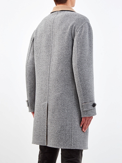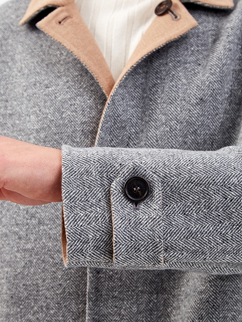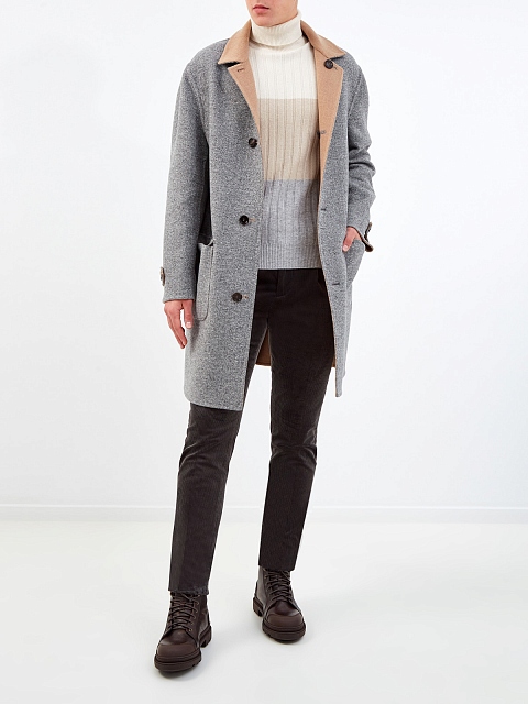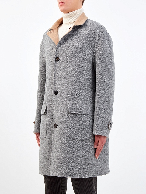 Двустороннее пальто-редингот от Brunello Cucinelli. Полностью натуральный состав из шерсти и кашемира образует теплую ткань оптимальной плотности. Фактурная черно-белая поверхность с шевронным узором дополнена матовой стороной в универсальном бежевом цвете. Ручная отделка обеспечивает максимальный комфорт и подчеркивает культовые ценности Модного дома. Детали: воротник с лацканами, застежка на пуговицы из рога, шлица для свободы движений. Сделано в Италии.