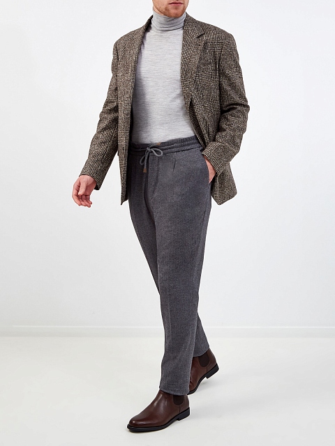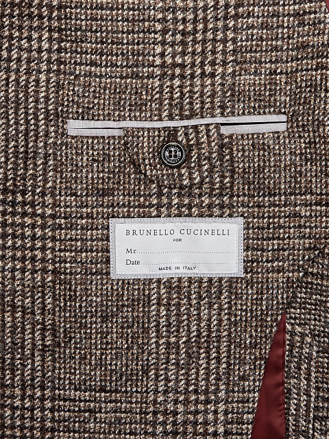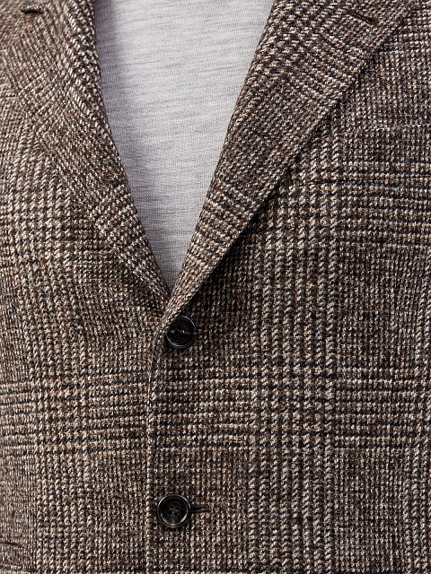 Элегантный мужской пиджак от Brunello Cucinelli выполнен вручную из плотной ткани на основе шерсти и альпаки. Сочетание классического кроя с эффектным узором в виндзорскую клетку в коричневой гамме делает модель идеальной как для официальных, так и для повседневных образов. Детали: полуподкладка из купро, накладные карманы, черепаховая фурнитура. Сделано в Италии.