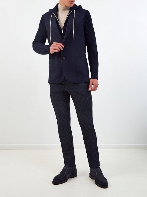 Комбинированный мужской пиджак от Eleventy сочетает плотную шерстяную ткань и трикотаж английской вязки. Модель в насыщенном оттенке индиго с капюшоном и двойной линией застежки станет идеальным дополнением образов в стиле casual. Традиционные отложные лацканы и черепаховая фурнитура придают изделию строгость. Детали: накладные карманы, вытачки для посадки по фигуре. Сделано в Италии.