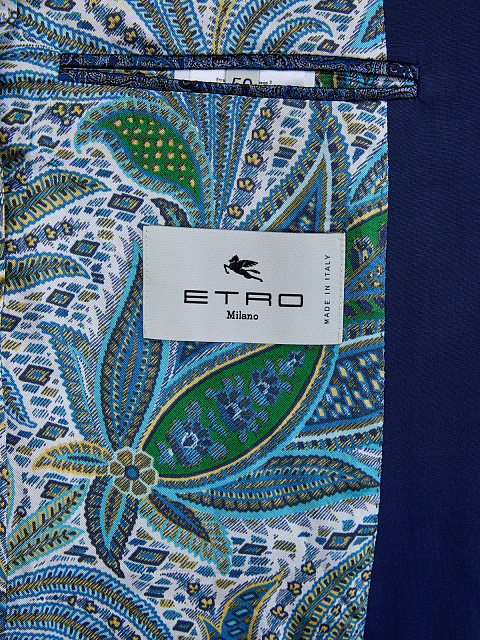 Классический мужской пиджак ручной работы от Etro выполнен из гладкой костюмной шерсти в синем цвете. Невысокий процент эластичных волокон в составе предотвращает появление складок и облегчает уход за изделием. Подкладка с фирменным принтом пейсли придает строгому образу штрих индивидуальности и обеспечивает посадку по фигуре. Простроченные швы нитью в тон и брендированные пуговицы завершают минималистичный дизайн. Детали: приталенный крой с вытачками, карманы с бортами, застежка на две пуговицы, шлицы на спинке. Сделано в Италии.