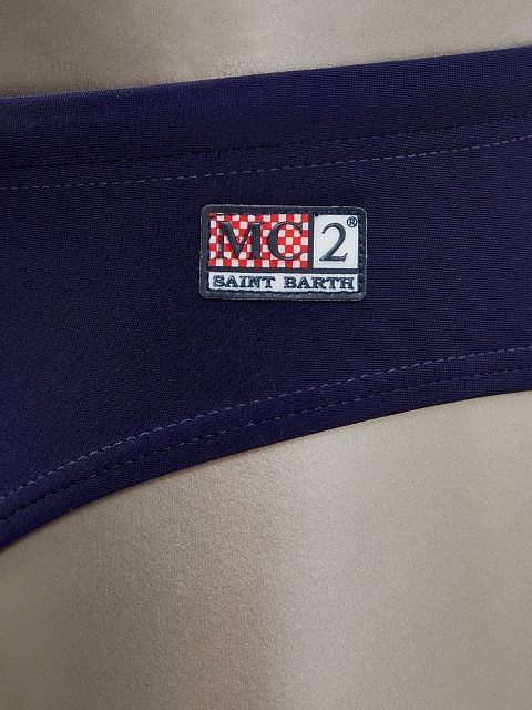 Комфортные мужские плавки-брифы MC2 Saint Barth облегающего кроя. Модель выполнена из тонкого эластичного материала с матовой поверхностью оттенка ночного неба. Изделие с заниженной посадкой на талии на эластичном конструктивном поясе. Плавки дополнены нашивкой с символикой бренда.