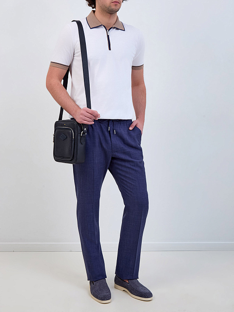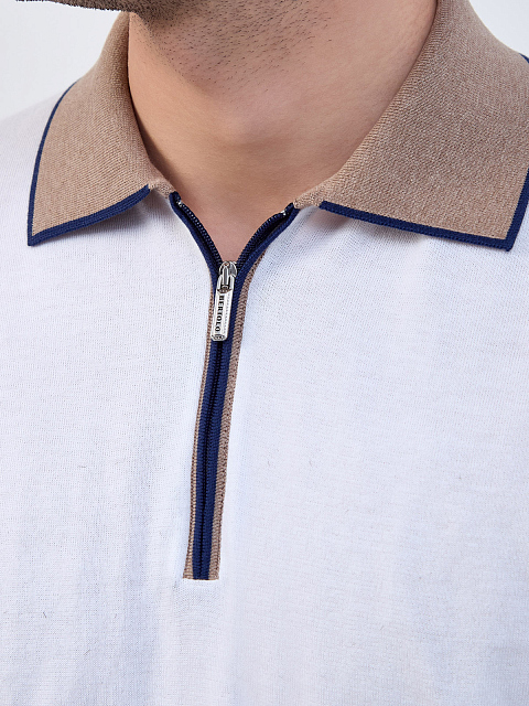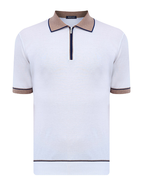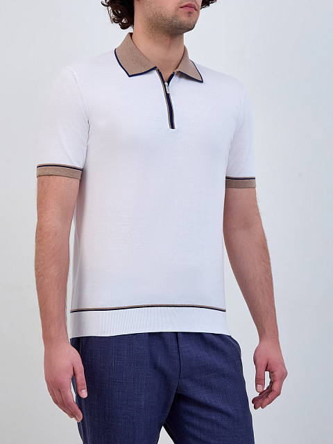 Стильное поло от Bertolo выполнено из тонкой чулочной пряжи на основе собранного вручную хлопка — полностью натуральный состав делает повседневные аутфиты максимально комфортными. Контрастная отделка кромок и окантовка в полоску вносит в образ неформальный акцент. Детали: отложной воротник, застежка на молнию с брендированным пуллером, короткие рукава. Сделано в Италии.
