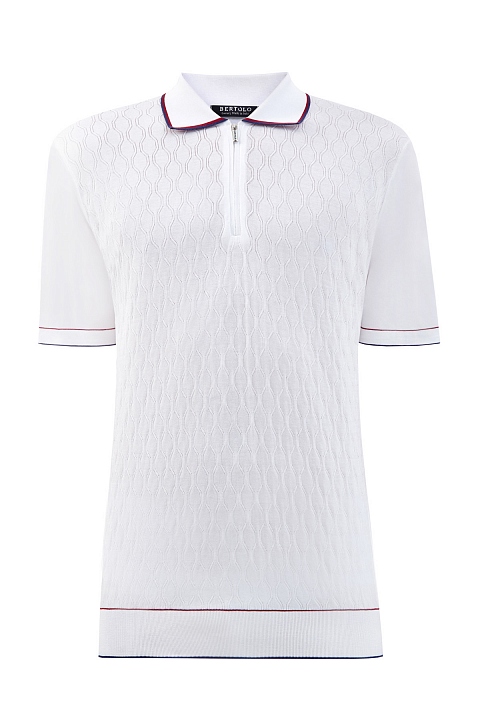 Джемпер-поло от Bertolo Cashmere выполнен из воздушной хлопковой пряжи с добавлением волокон шелка. Классический крой дополнен фактурным вязаным орнаментом. Цветовые акценты вносит контрастный узор в тонкую полоску в по краям. Модель с традиционным отложным воротом из плотного трикотажа, застежкой-молнией с тисненой монограммой на пуллере, а также окантовкой рукавов и нижнего среза эластичными элементами в рубчик для посадки по фигуре. Сделано в Италии.