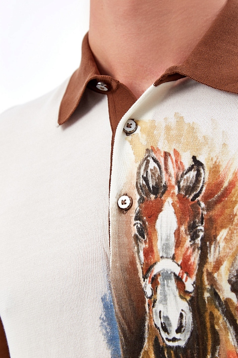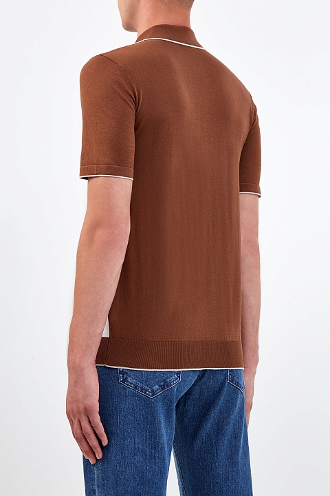 Мужской джемпер-поло от Bertolo Cashmere создан из хлопковой пряжи в богатом оттенке виски. Особенностью модели стал культовый акварельный принт, который подчеркивает фирменную эстетику бренда. Изделие традиционного кроя с классическим отложным воротником и застежкой на граненые пуговицы из перламутра. Кромки дополнены окантовкой в рубчик для посадки по фигуре. Сделано в Италии.