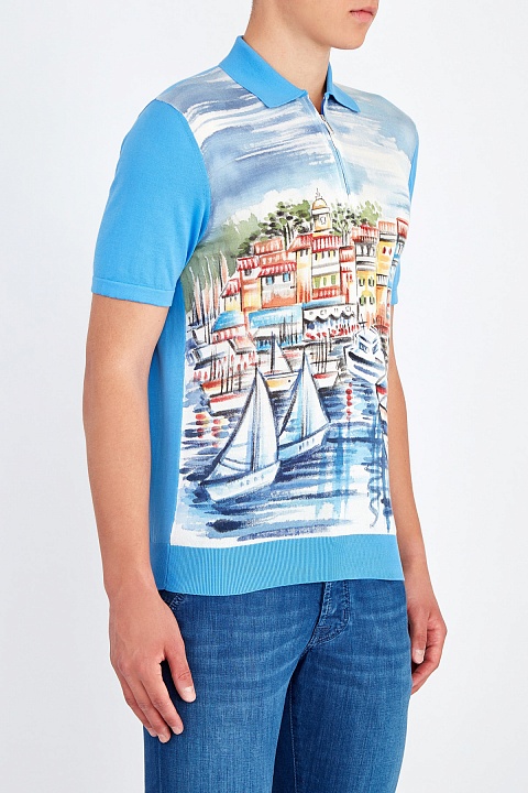 Яркое мужское поло силуэта по фигуре от Bertolo Cashmere выполнено в лазурном оттенке из хлопковой пряжи с вплетенной шелковой нитью, которая делает фактуру более гладкой и струящейся. Культовый принт в виде написанного акварелью пейзажа подчеркивает фирменный стиль. Эластичная отделка кромок обеспечивает посадку по фигуре, застежка на скрытую под планками молнию завершает изделие. Сделано в Италии.