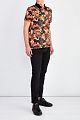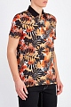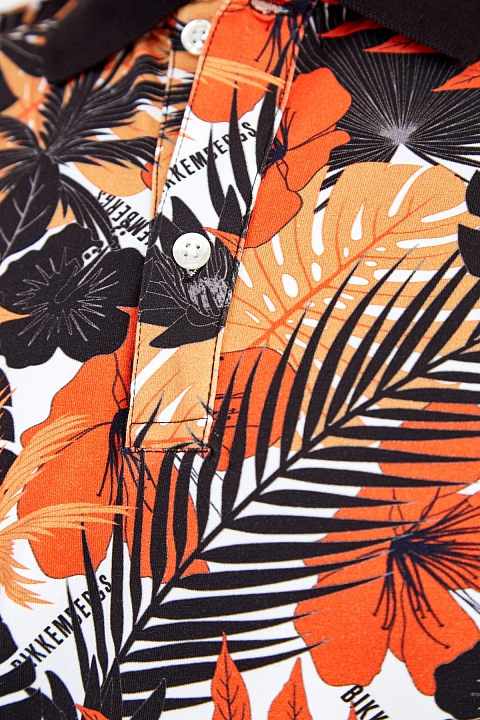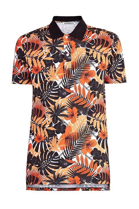 Яркая мужская футболка-поло от Bikkembergs выполнена из хлопкового джерси stretch с гладкой фактурой. Особенностью модели стал яркий набивной принт с лиственным мотивом в охровой гамме. Детали: отложной однотонный ворот из плотного трикотажа, застежка на пуговицы, кромки закрыты объемным швом двойной иглой.