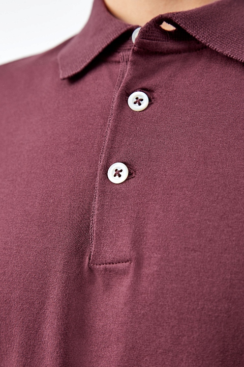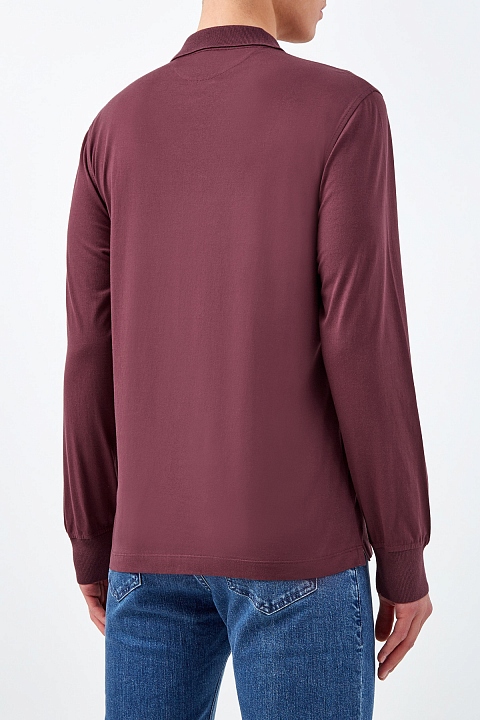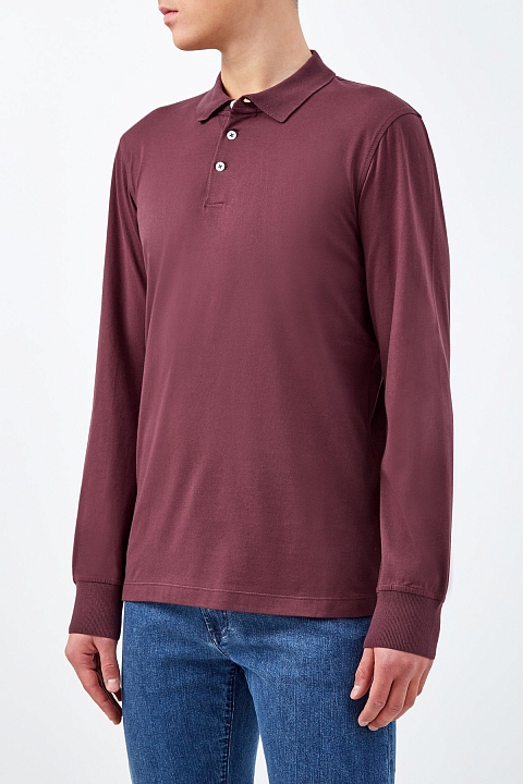 Базовая мужская футболка-поло от Brunello Cucinelli выполнена из плотного хлопкового джерси в оттенке ягодного вина. Эластичные манжеты в рубчик, а также воротник и линия застежки вносят в образ дополнительные фактуры, создавая выгодный контраст. Детали: длинные рукава, застежка на пуговицы из перламутра, разрезы в боковых швах. Сделано в Италии.