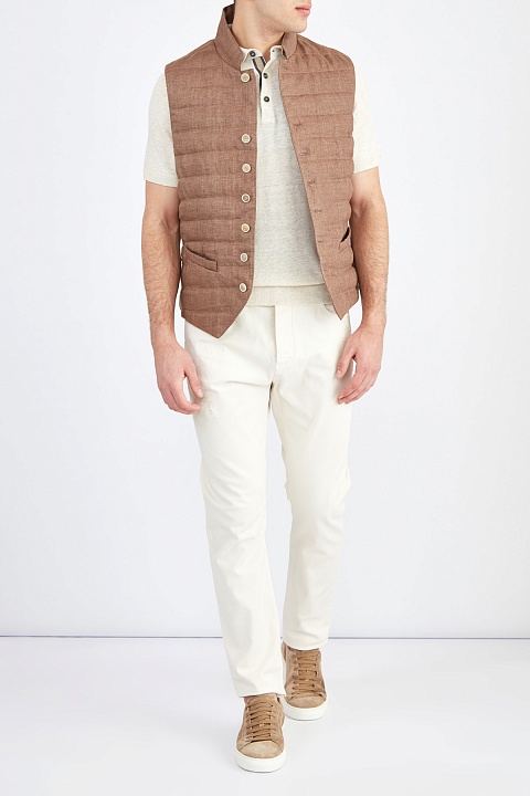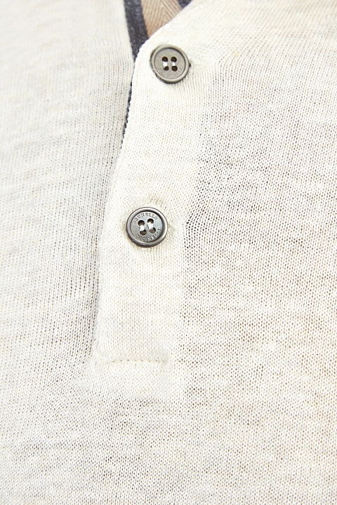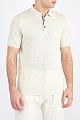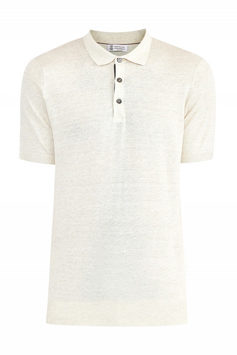 Лаконичный мужской джемпер-поло кроя по фигуре от Brunello Cucinelli создан из тонкой хлопковой пряжи с добавлением волокон льна в оттенке слоновой кости. Изделие с классическим отложным воротом из плотного трикотажа дополнено контрастной тесьмой в серых и бежевых тонах по линии застежки. Нижняя кромка и манжеты коротких рукавов закрыты эластичной резинкой для комфортной посадки. Сделано в Италии.